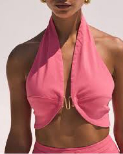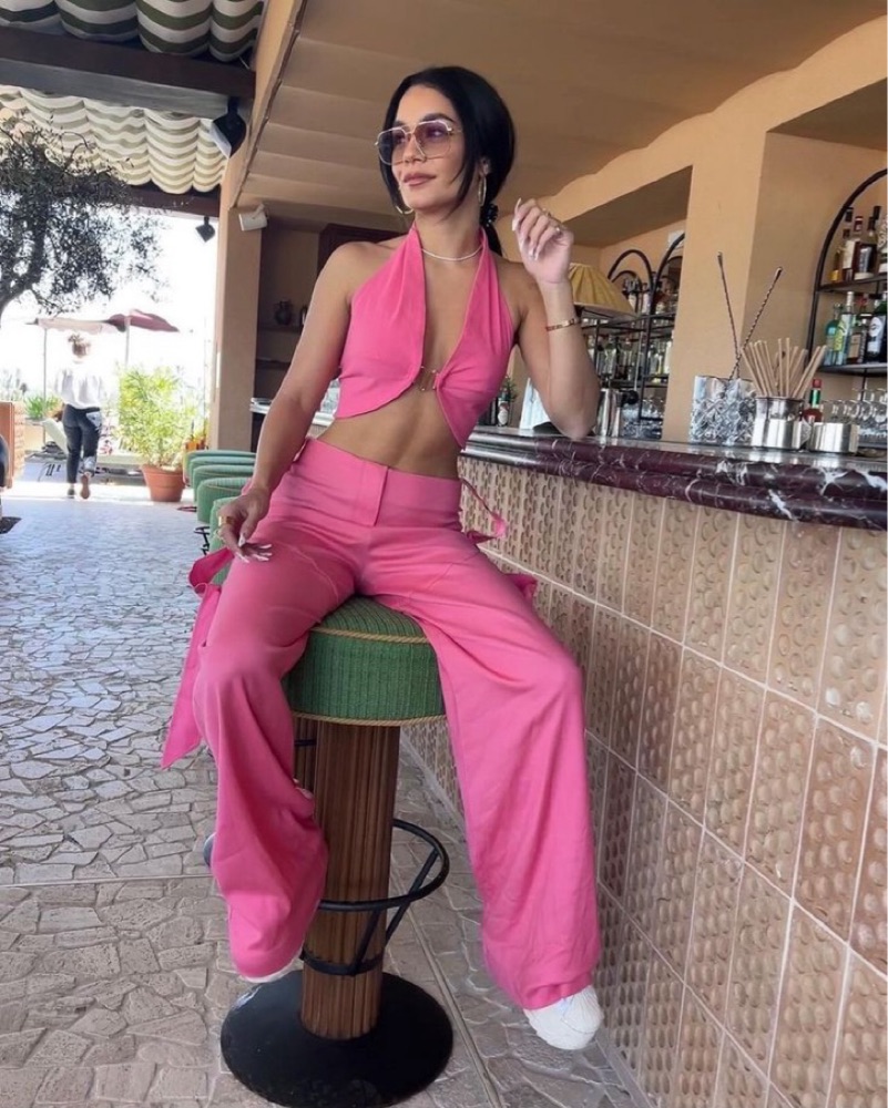This playful, all-pink ensemble is perfect for a chic poolside party or tropical getaway. The halter-style crop top and wide-leg palazzo pants create a stylish, coordinated look.