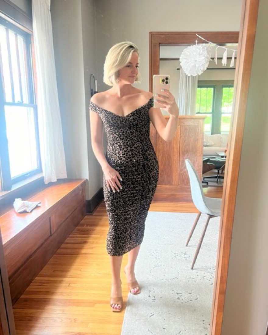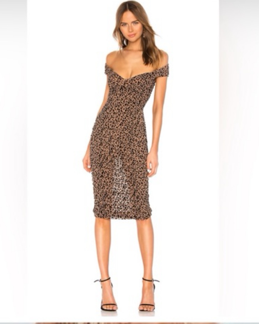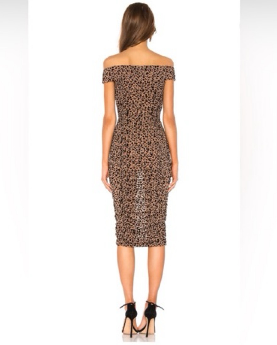 Off the shoulder, leopard, cheetah dress that hugs every inch with a lot of forgiveness in the fit