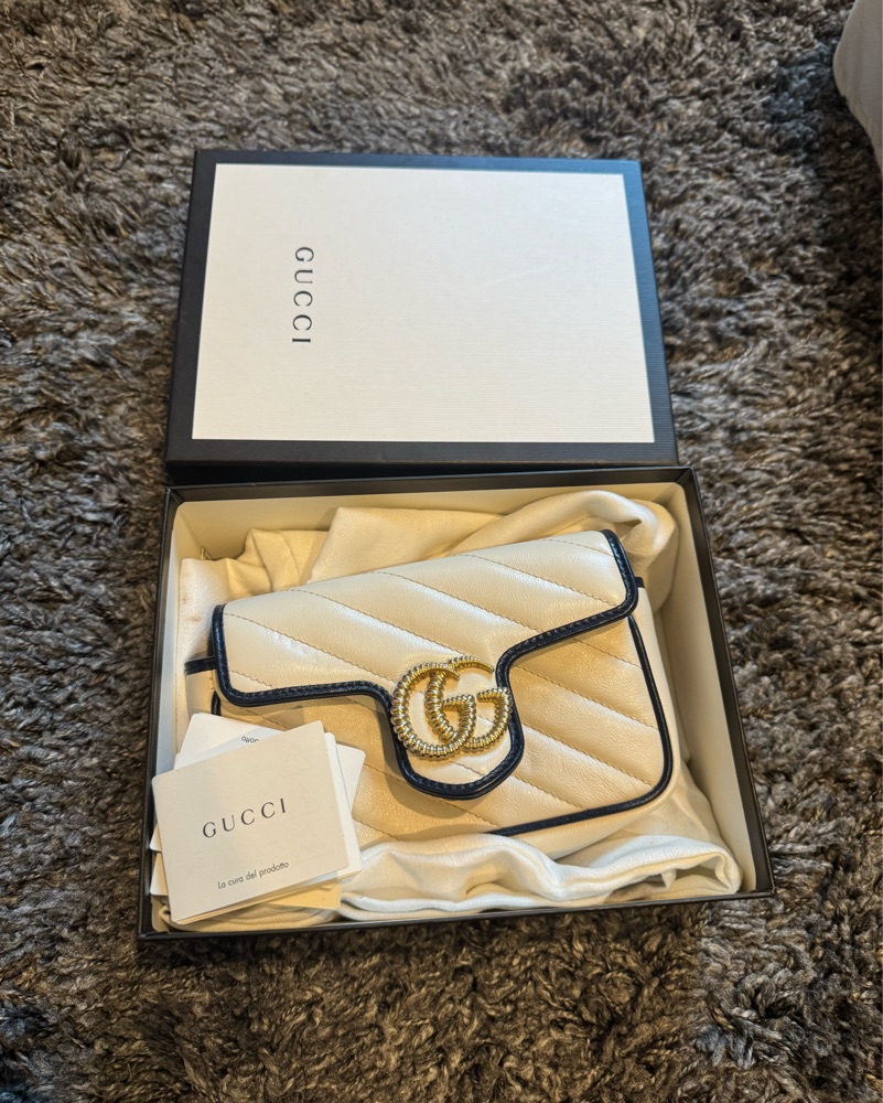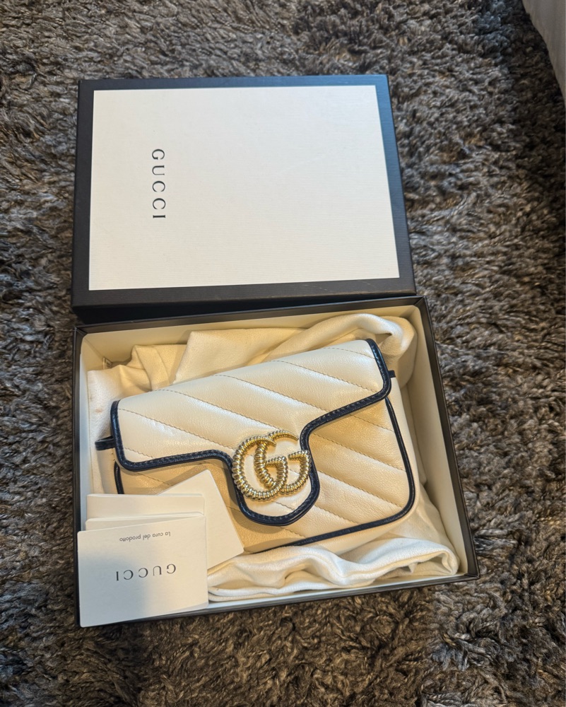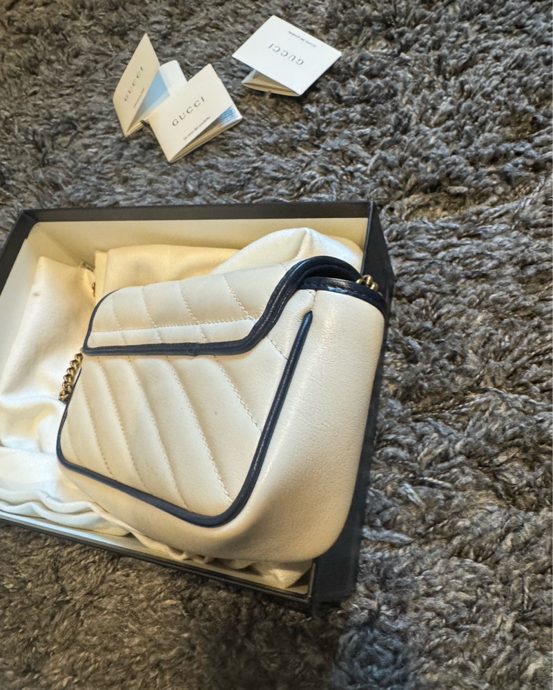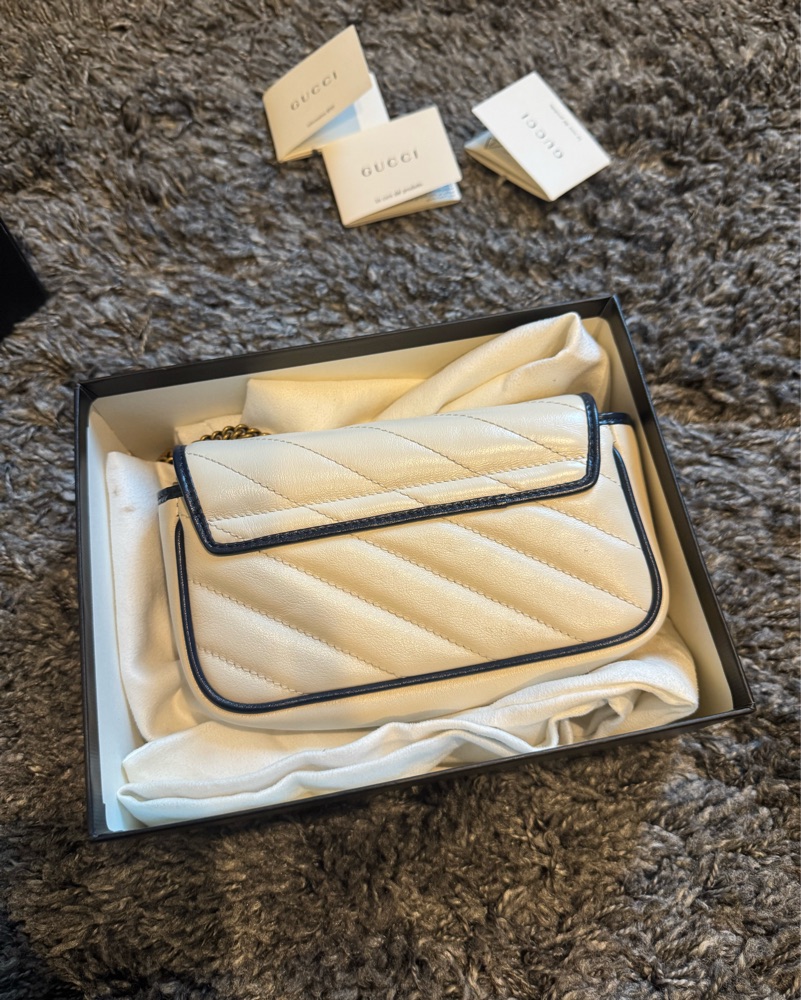 Vintage Effect Calfskin Matelasse Diagonal Super Mini Torchon GG Marmont Shoulder Bag Mystic White Blue Agata