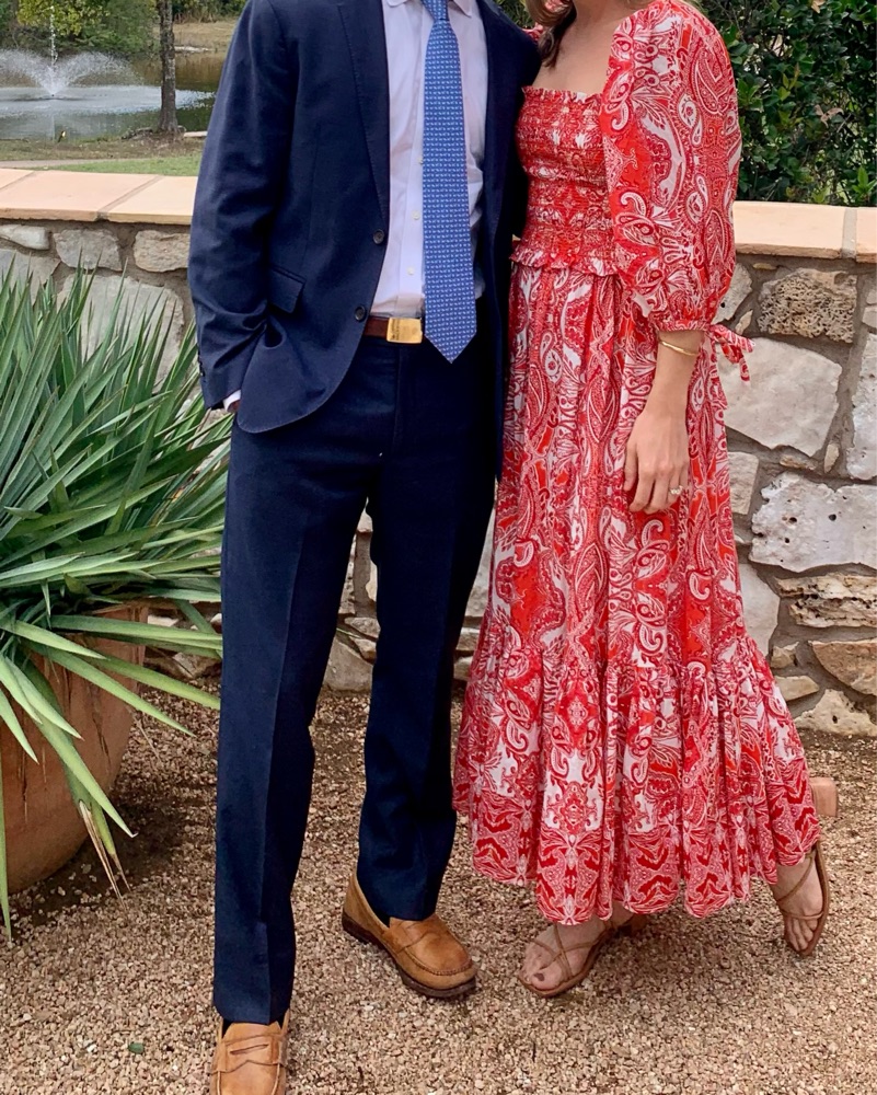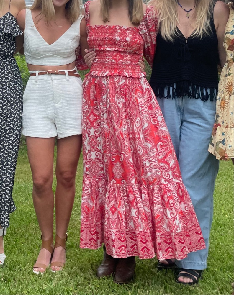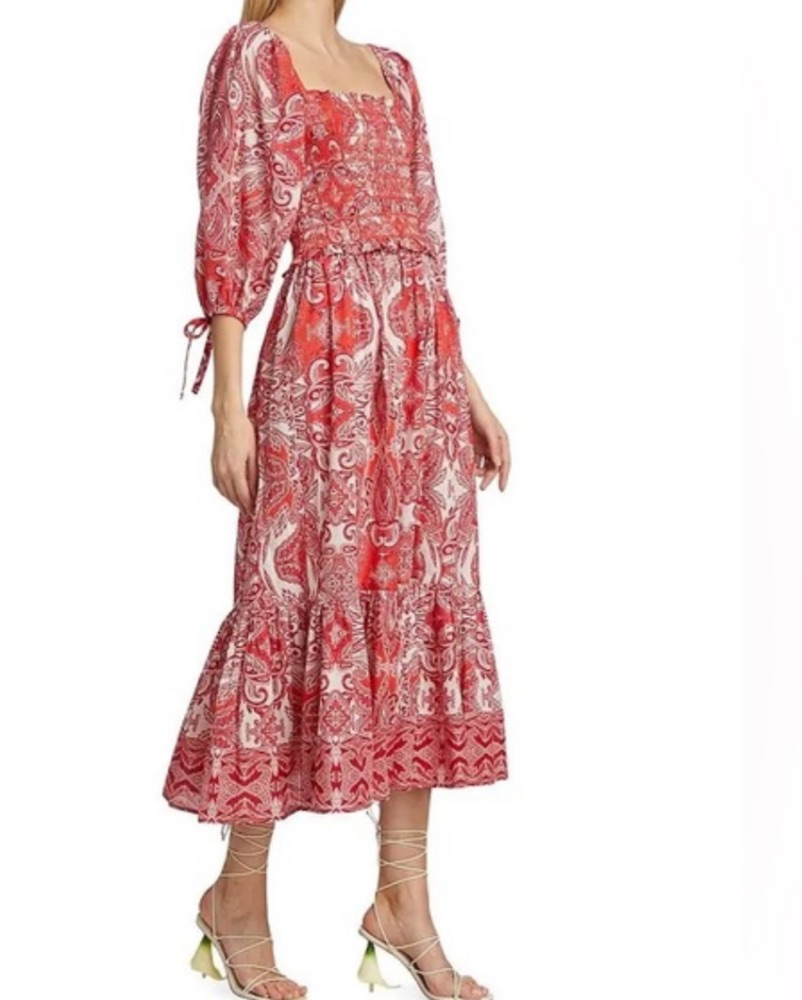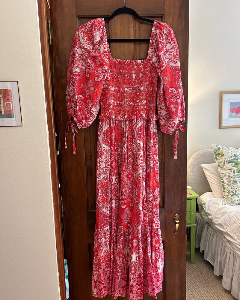 midi, red and pink paisley dress, full three quarter sleeves, fitted bodice