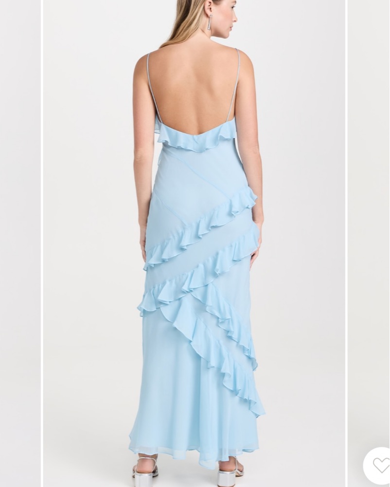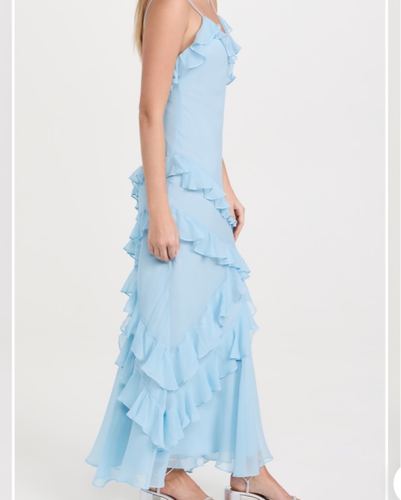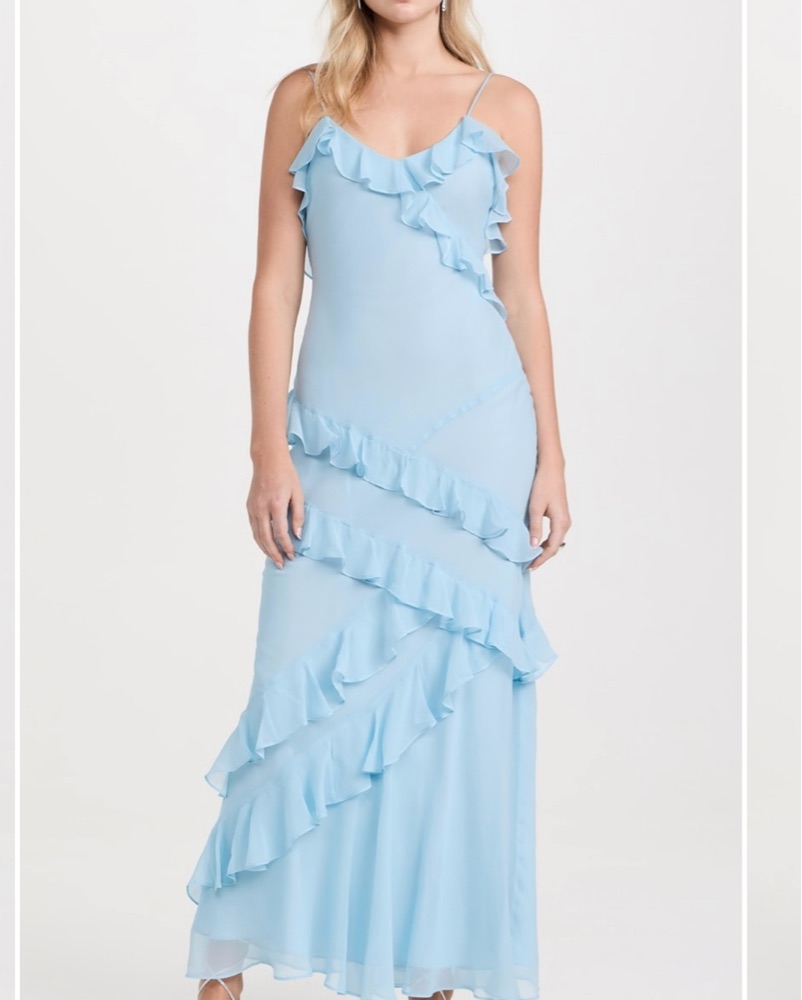 Dress is a light aqua and perfect for summer weddings, vacation, or any formal occasion! It’s super lightweight and flowy. Only worn once, very good condition. Color on website listed as “Aqua Mist” :)
