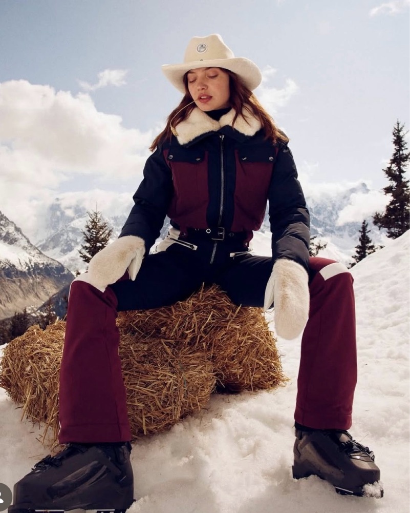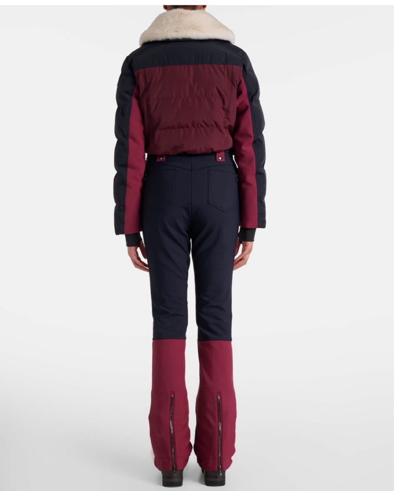The Karei ski suit is defined by its detachable faux fur collar and color-blocked design, offering warmth and style for alpine adventures.