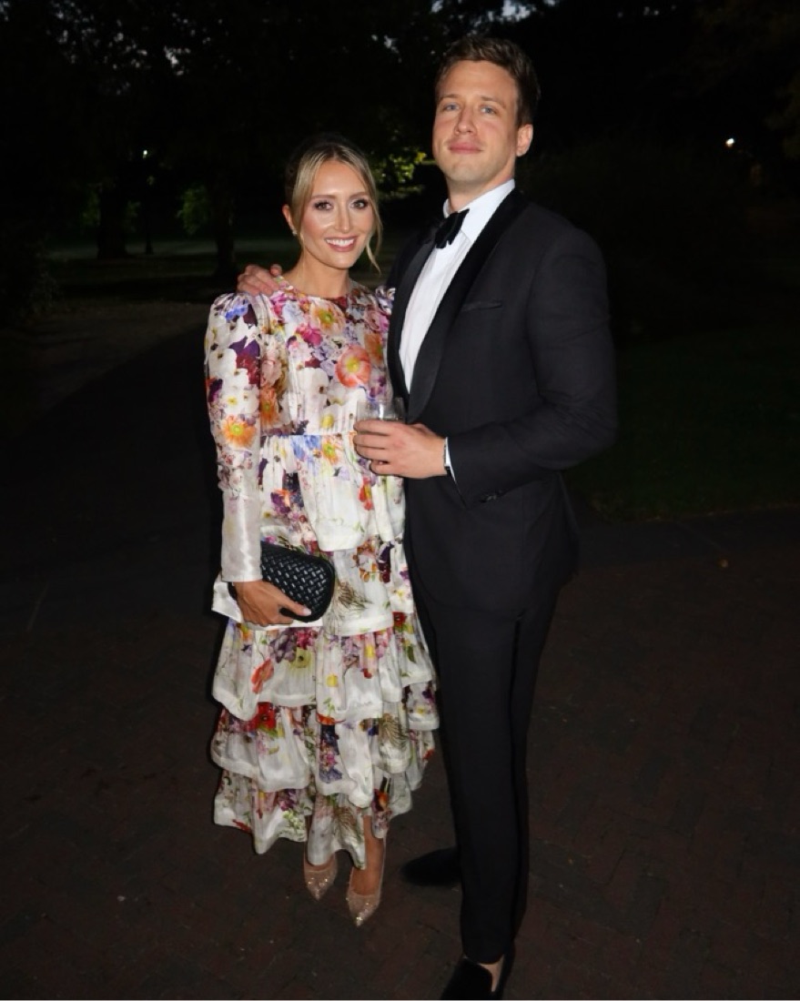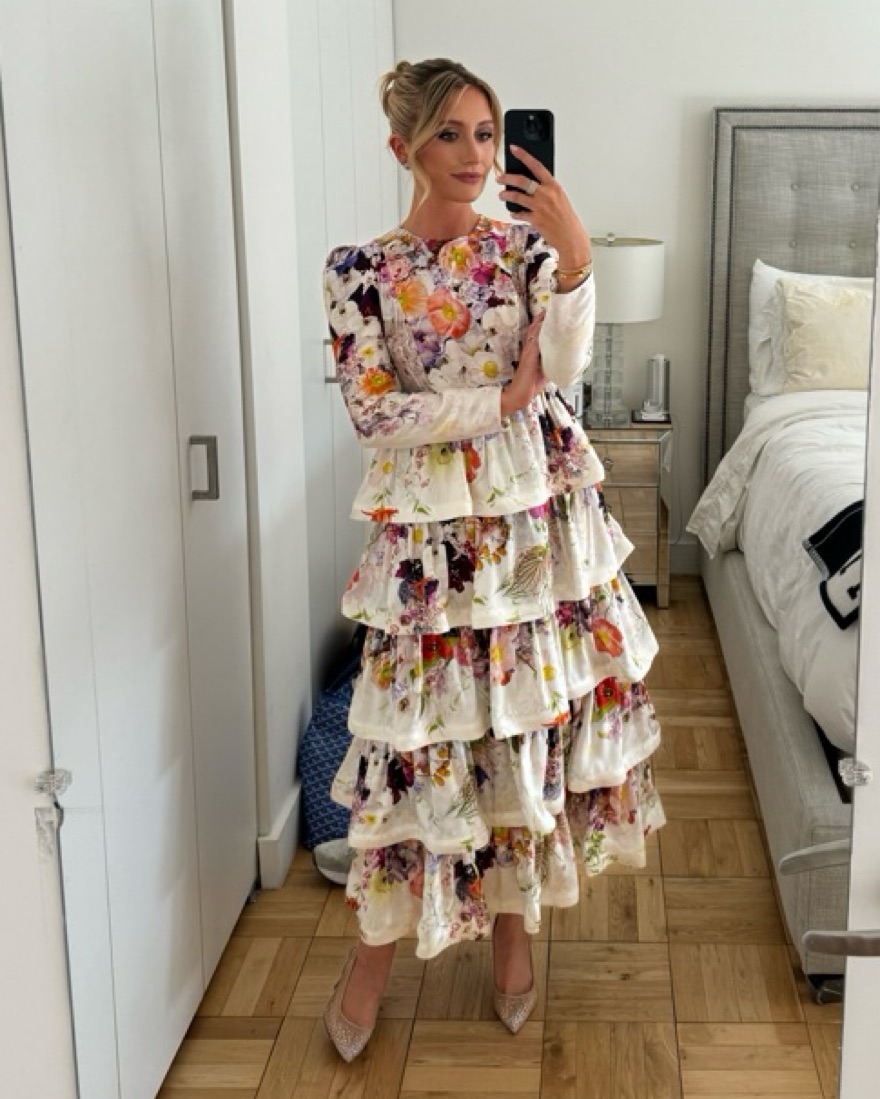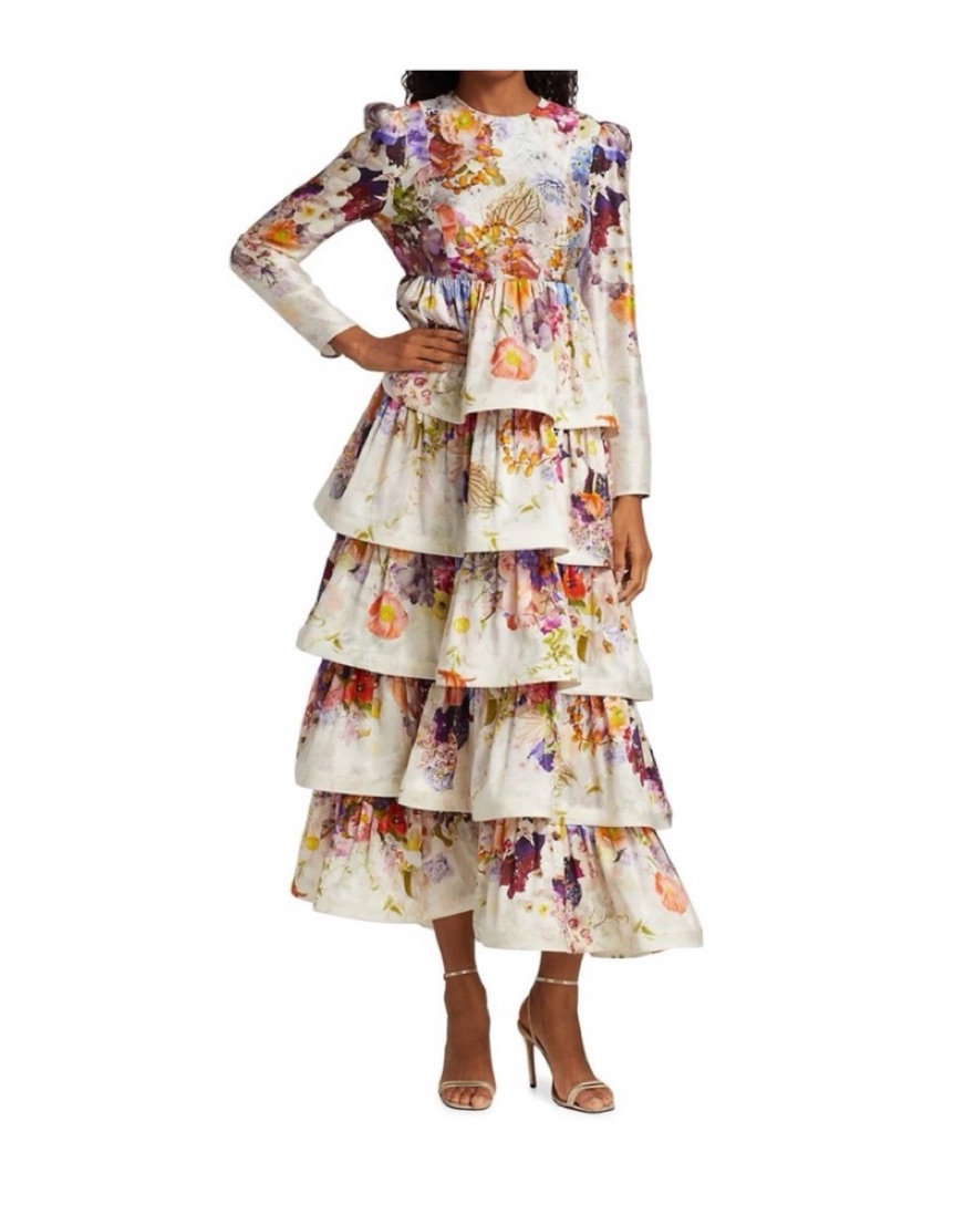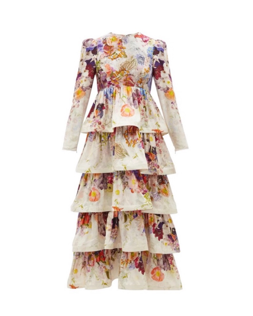 Zimmerman’s prima tiered is crafted from cascading tiers of floral-print poplin depicitng illustrated watercolor blooms and framed with lightly gathered shoulders and long sleeves.