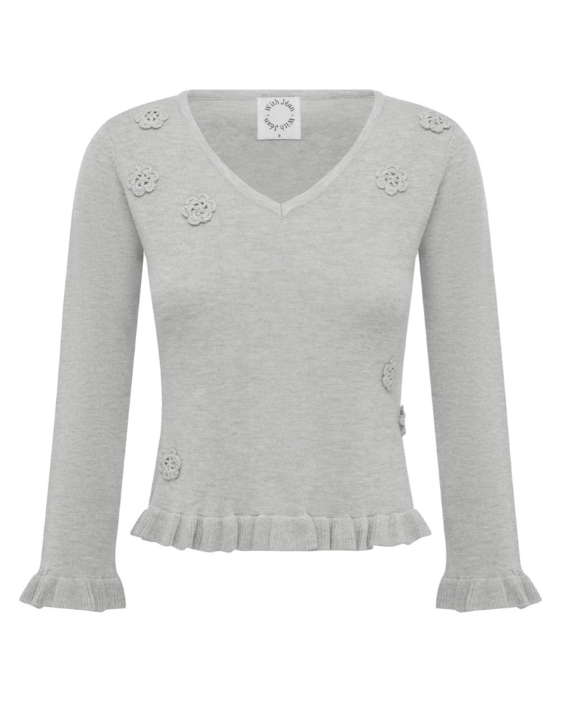 The Hazel Top is a knitted top featuring 3/4 length sleeves, custom floral applique detailing, and ruffle detailing on the sleeves and hem.