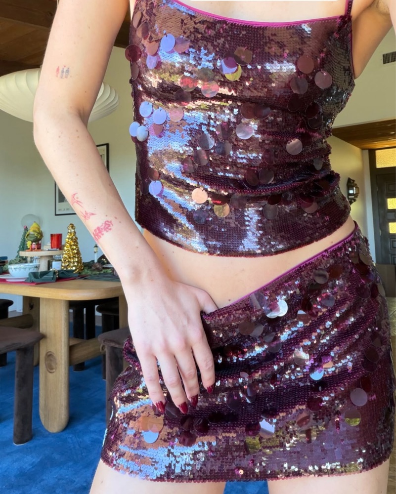 Guizio Paillette Mini Skirt And Cami in Merlot. This set is perfect for a night out. It fits S/M.