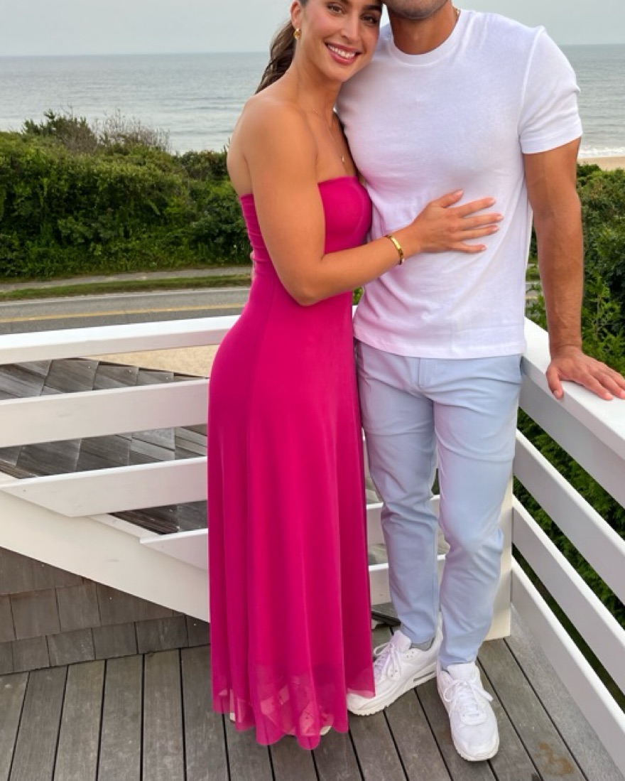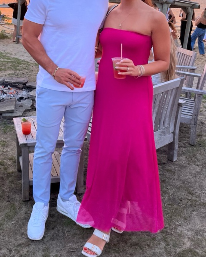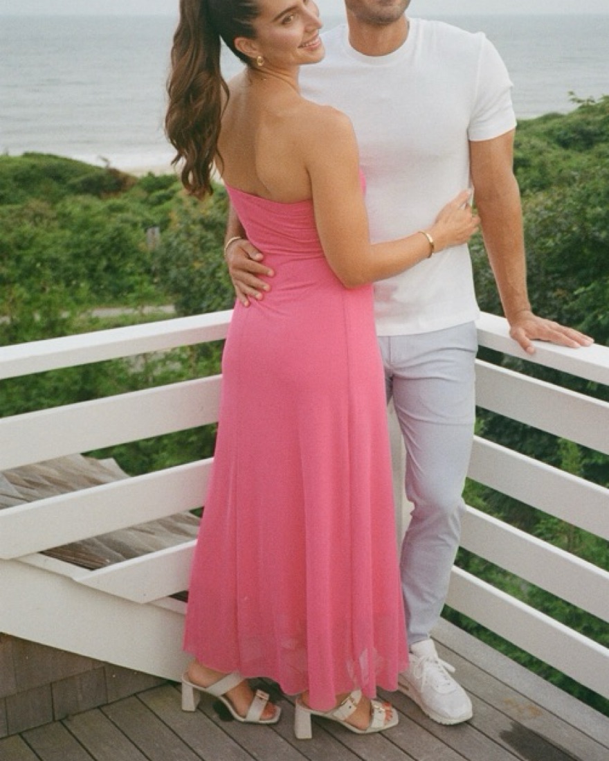 The perfect strapless summer dress! I get so many complements when I wear this 😊Gorgeous pink color. Material is stretchy, lightweight and so comfy. Size small, fits true to size.