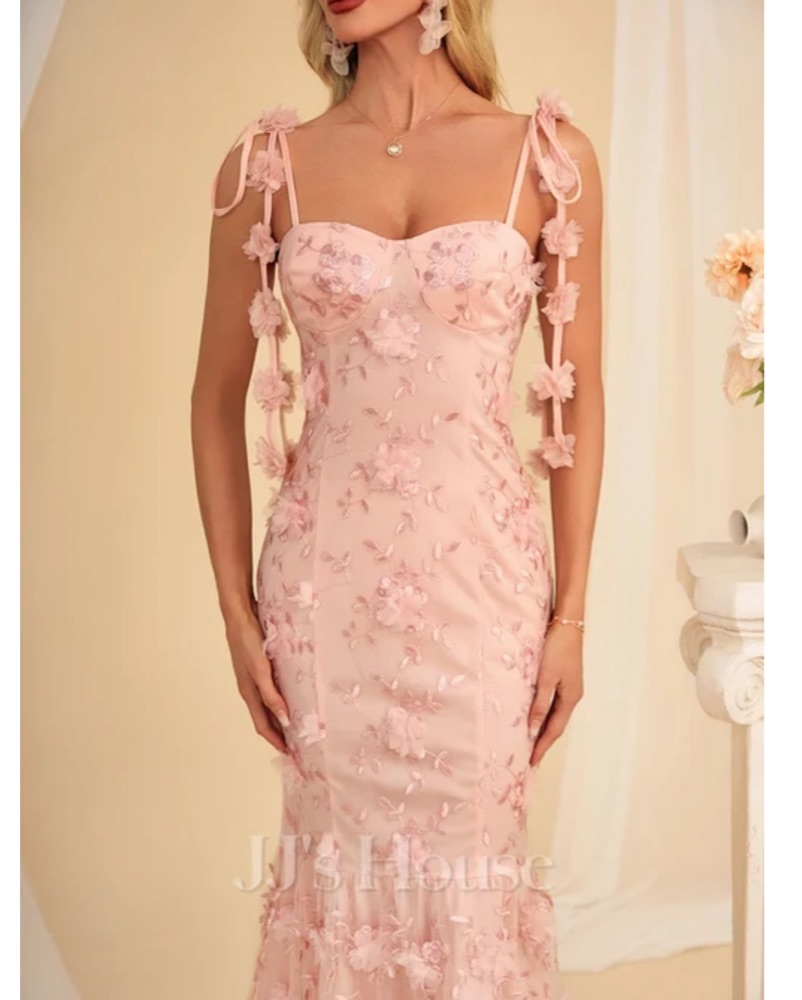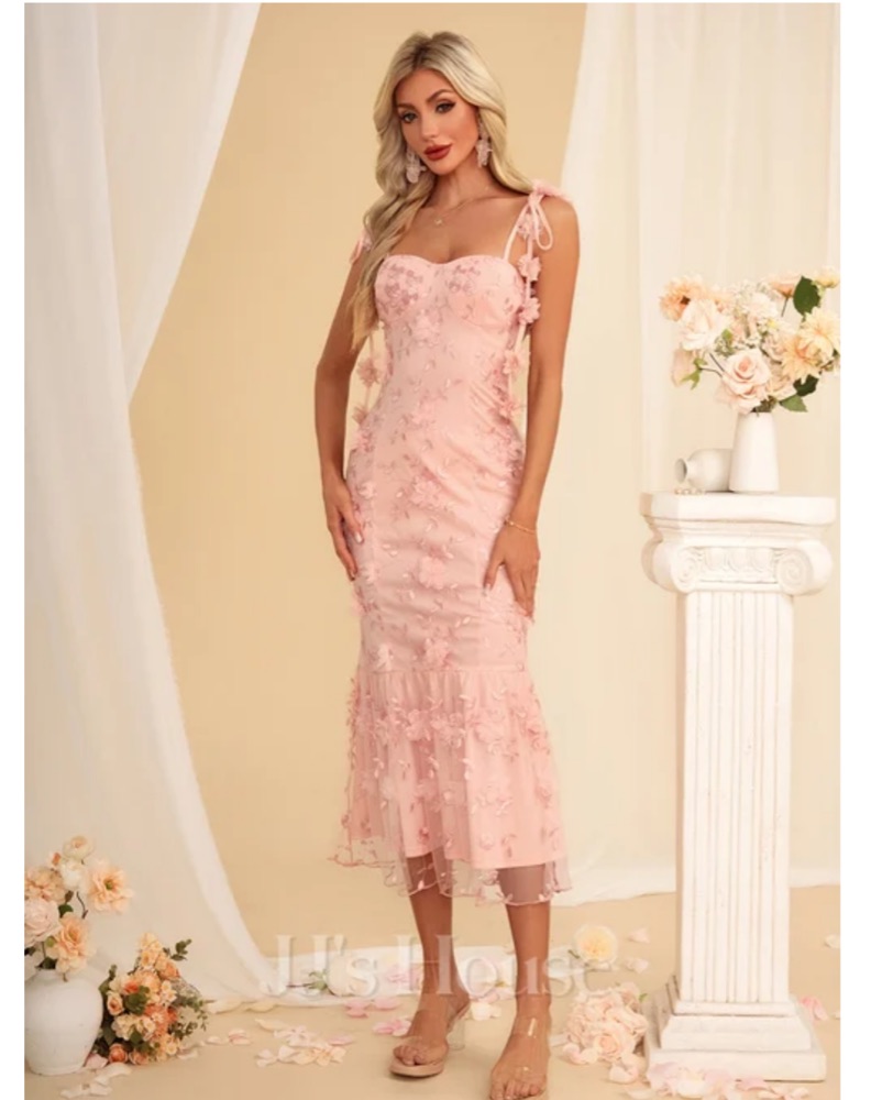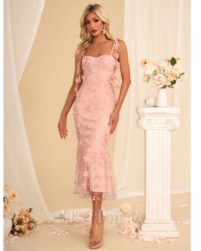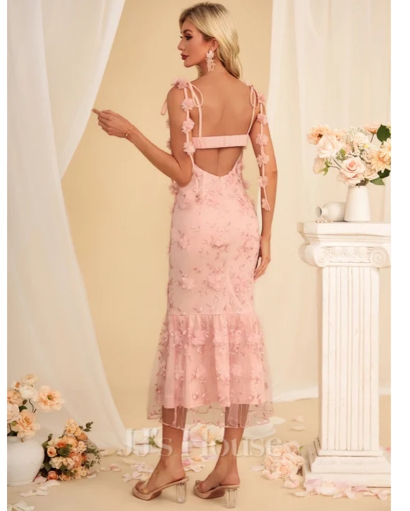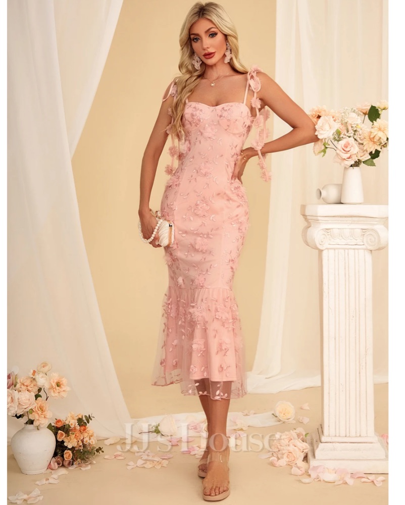 This elegant midi dress features a romantic floral design in a gorgeous soft pink hue. Perfect for a special occasion or formal event.