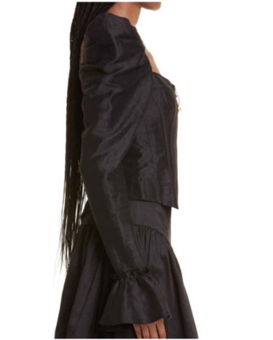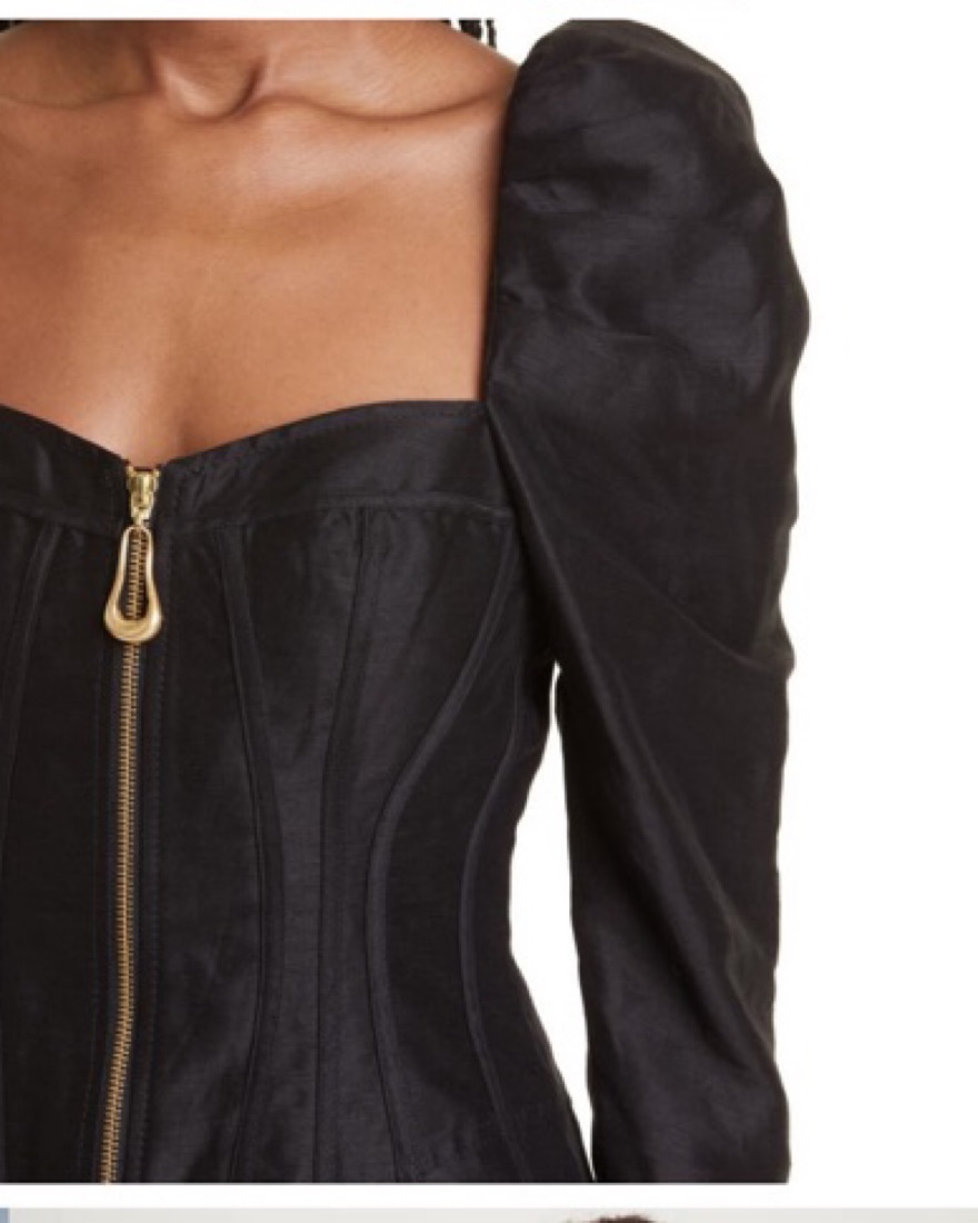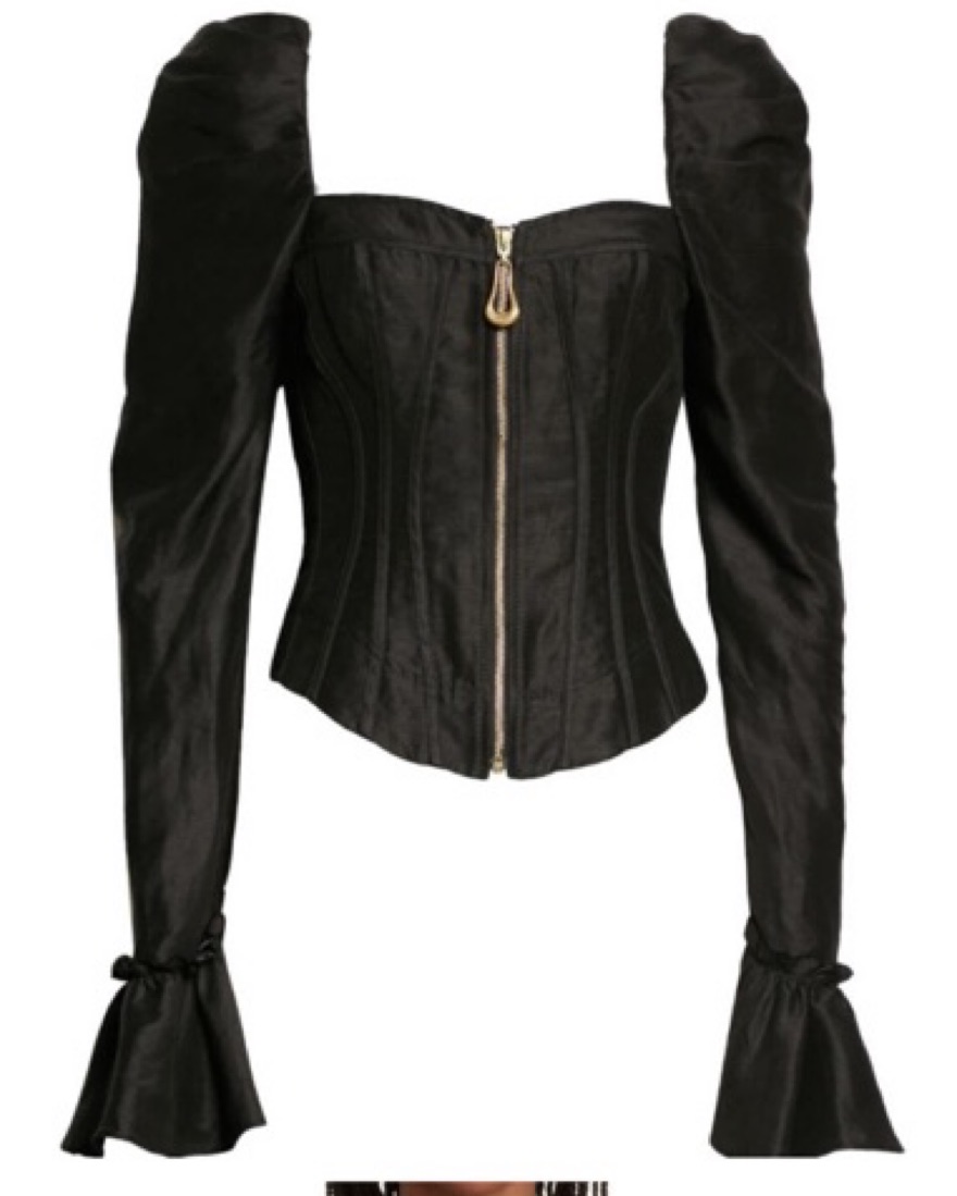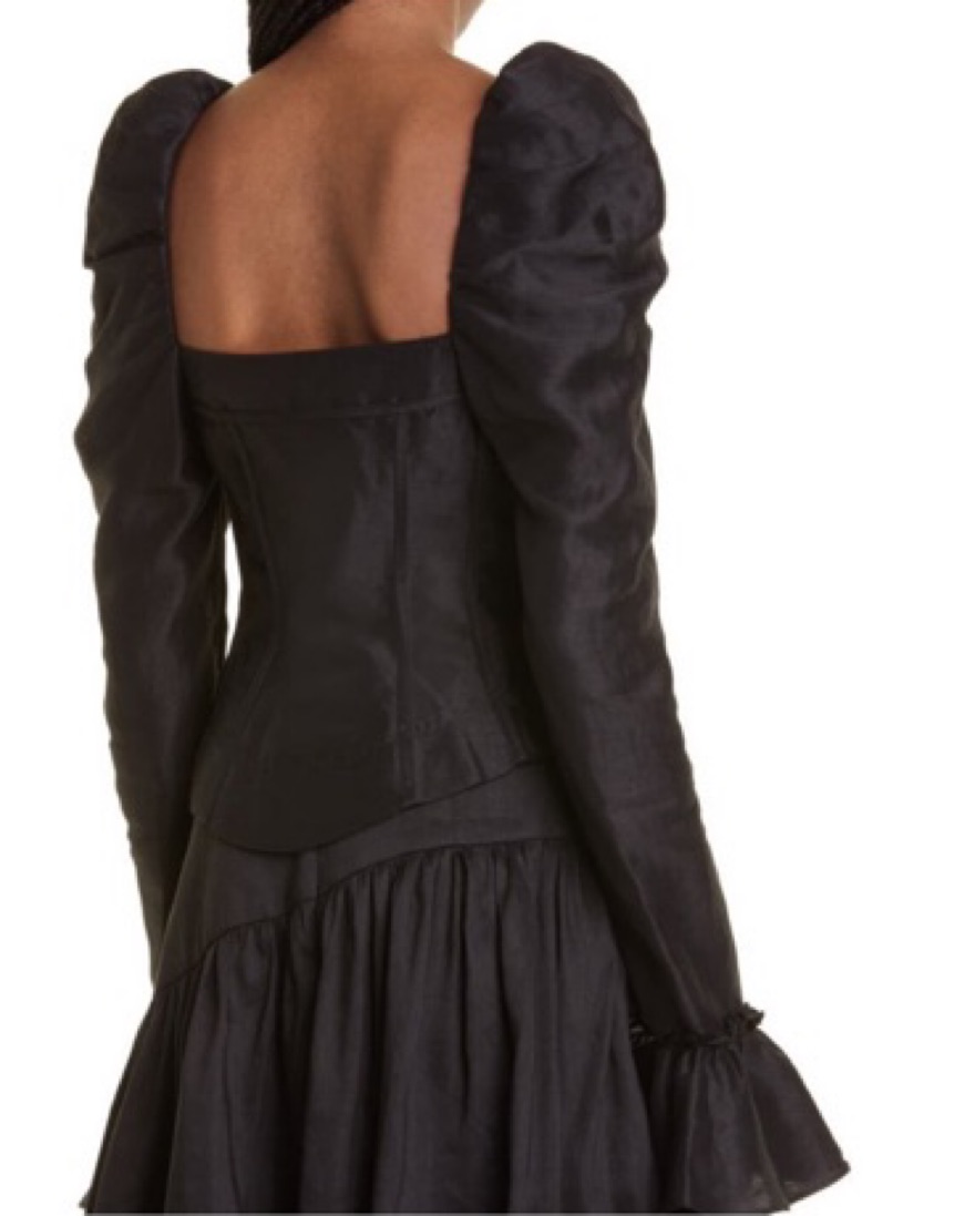A corset bodice and Juliet sleeves further the romance of this linen-blend blouse accented with ruffled cuffs and a goldtone zipper.