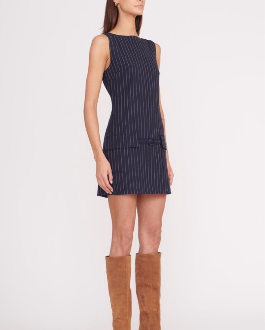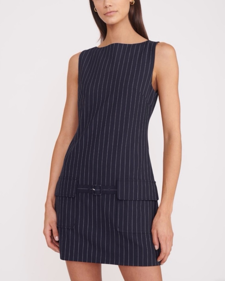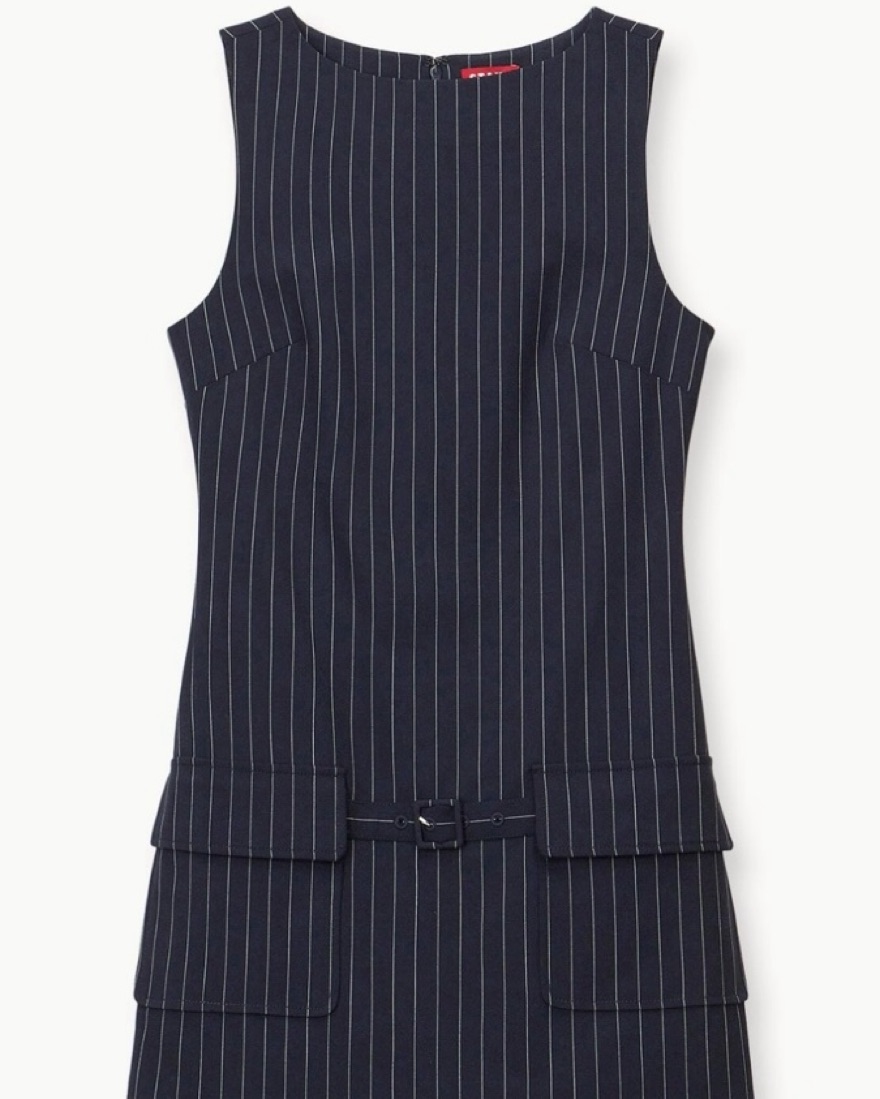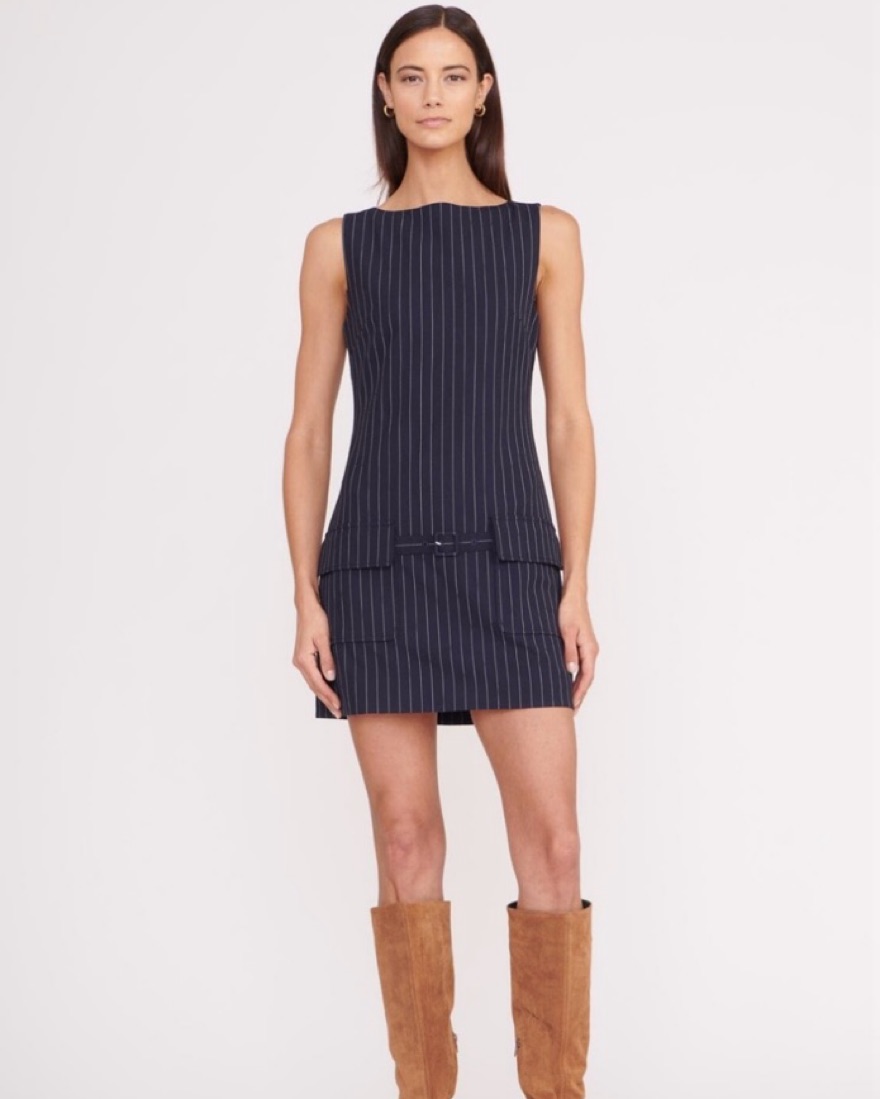 The Sheila Dress offers a classic silhouette with allover pinstripe print to take you from day to night. This style features a boat neck, two front flap pockets and belt detail.