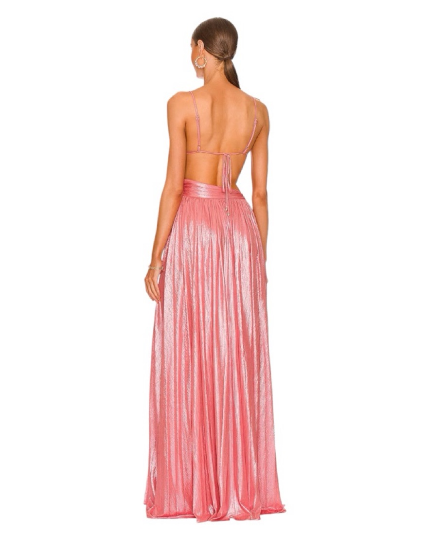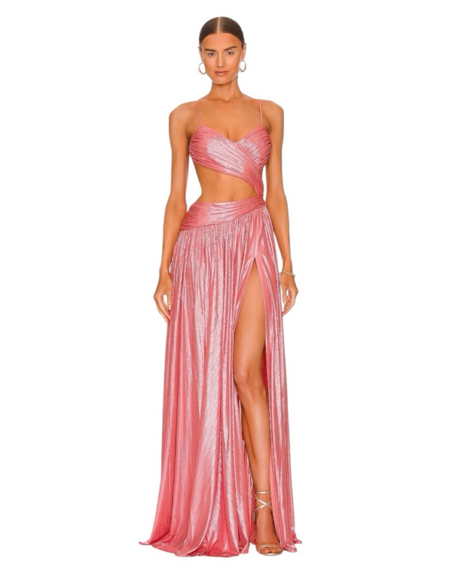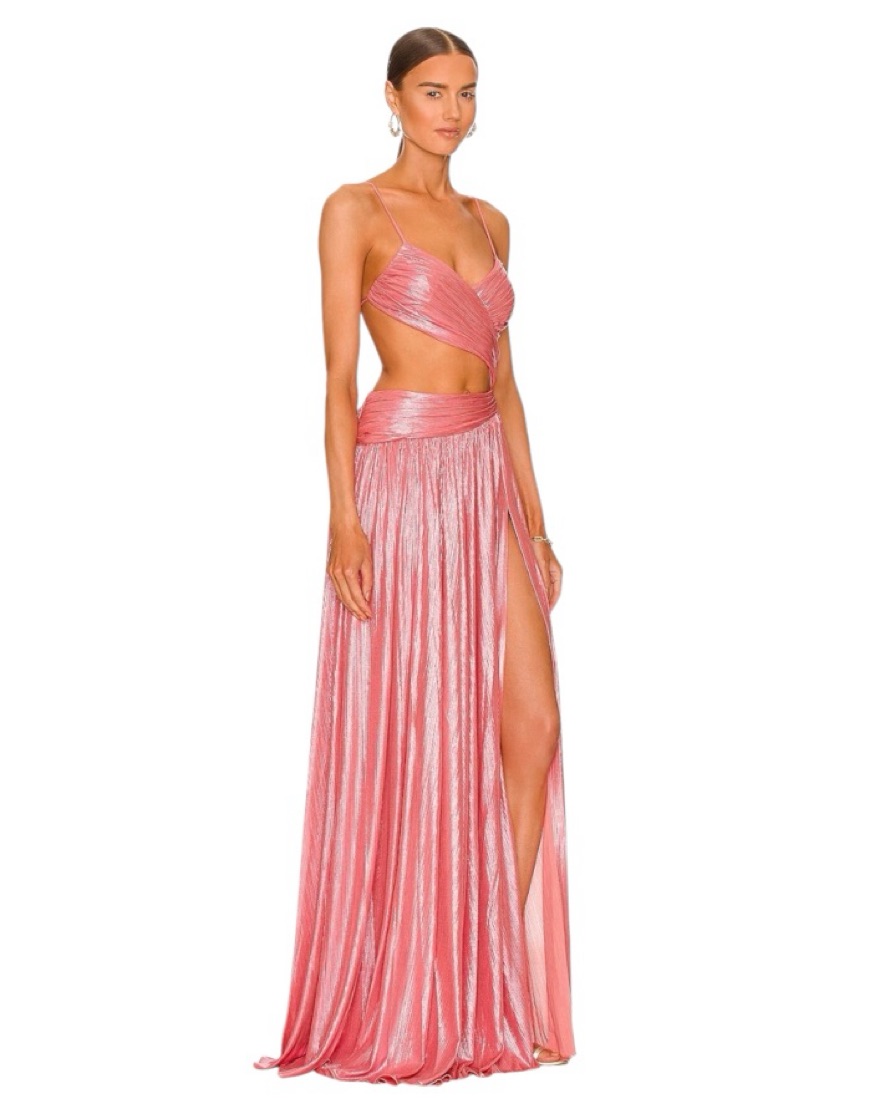 Hotttt cut out pink sparkly maxi dress by retrofete! Deep v neck, sleeveless and with a slit detail. Perfect for a summer wedding or vacation.