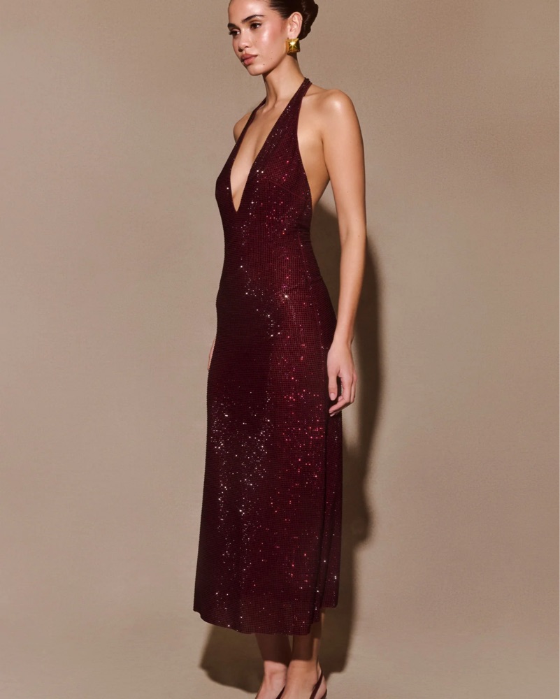 meshki genie diamante halter dress in mahogany size S in brand new condition. features a chic halter neckline and sparkling diamante detailing. gorgeous and perfect for evening events, parties, cocktail attire, or date nights. pickup by penn station