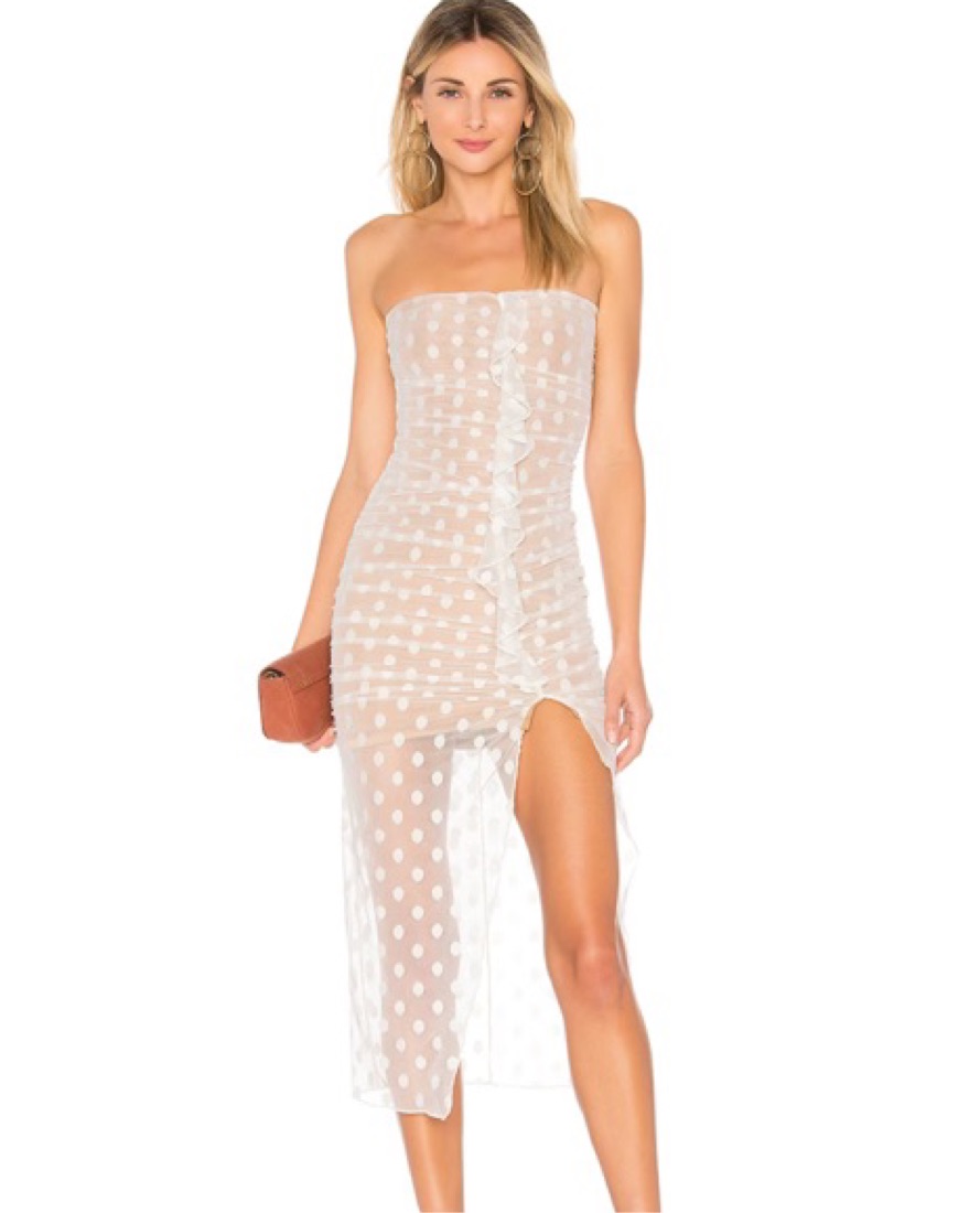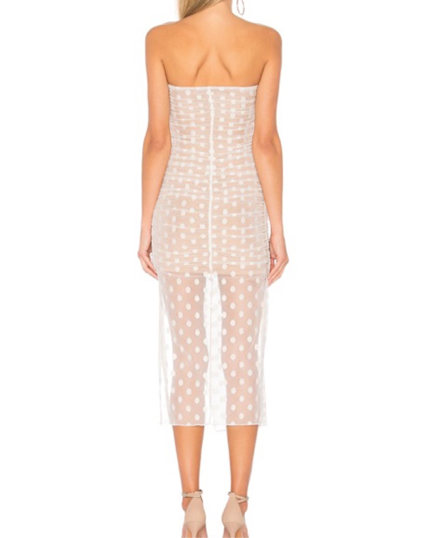 White mesh polka dot midi dress with nude lining and thigh slit! So flattering!