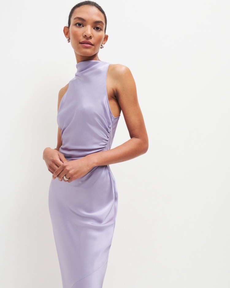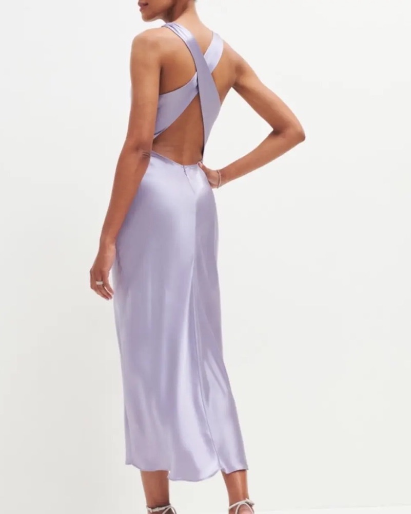 100% silk midi dress in purple lilac Aura with cowl neck and criss cross open back detail.