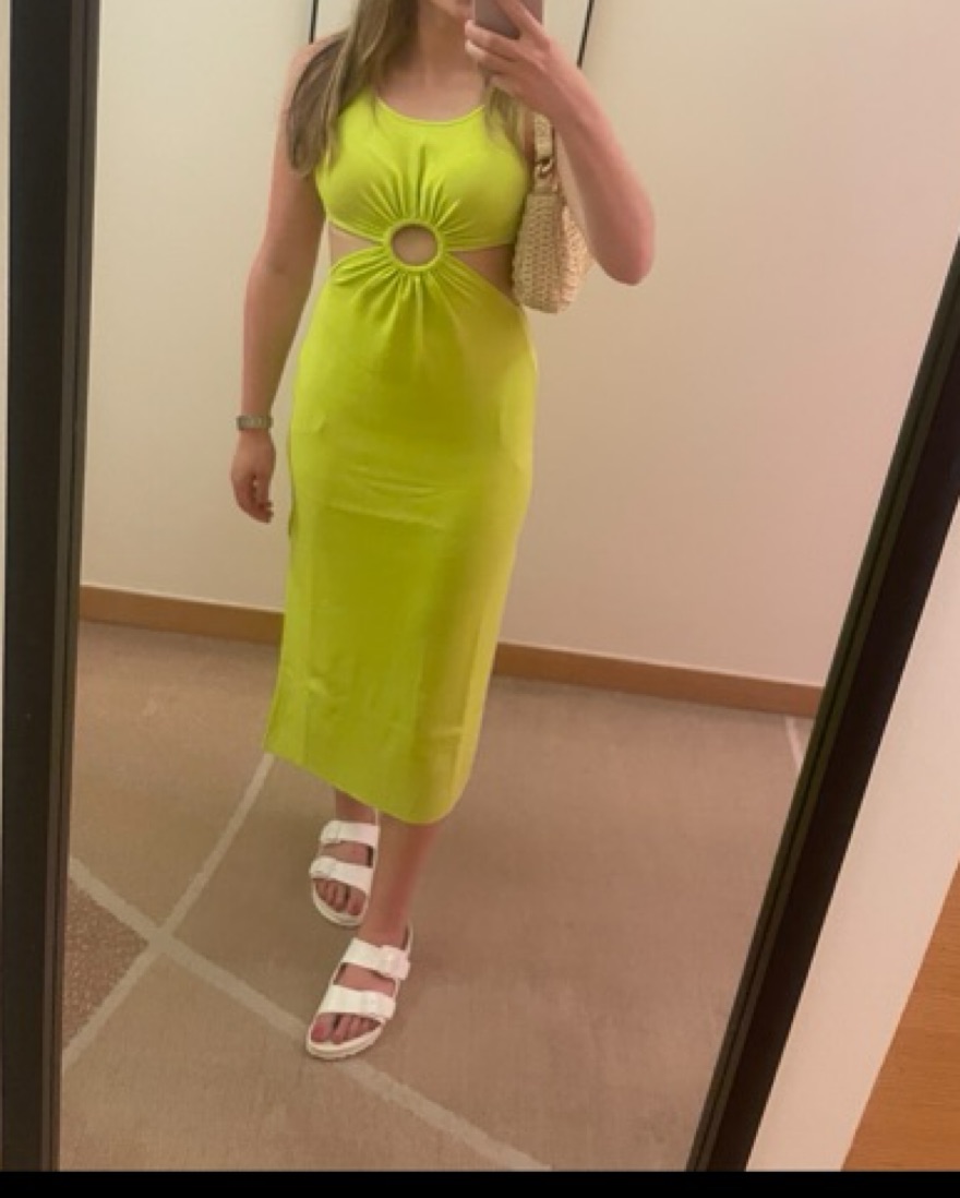 65% viscose, 35% nylon Ruched accent ring at waist Side and back cut-out Ribbed knit fabric with side seam slits
