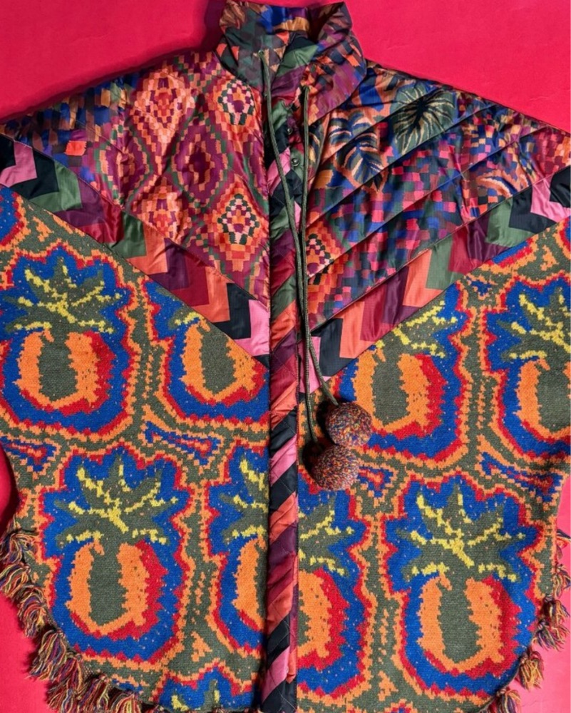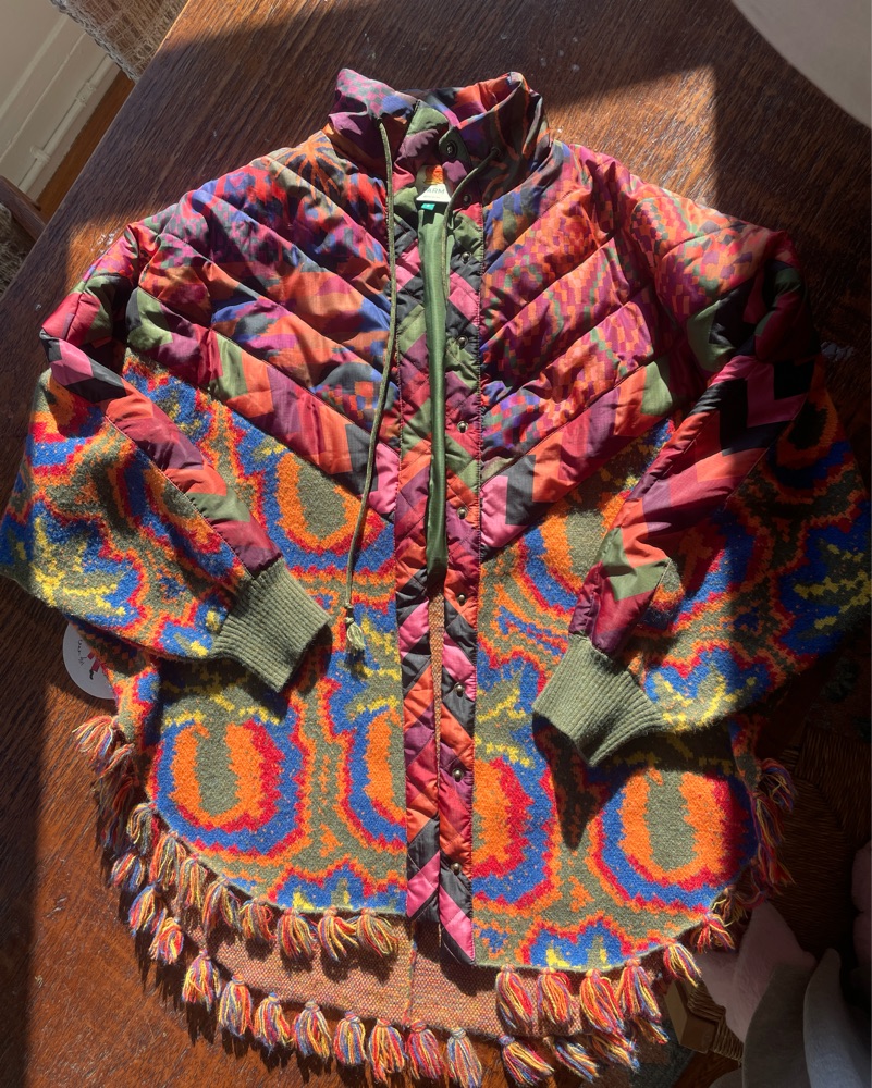 Statement jacket!! Such a fun one for festivals or park bdays or just breathing life into this season of Karl. Condition note: missing the pompoms on the drawstrings. No pockets. Size S but fits M/L (my usual size 8-10)