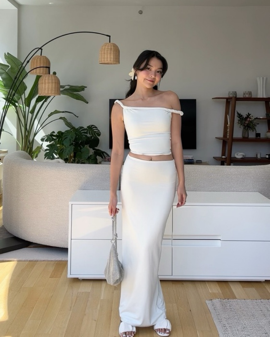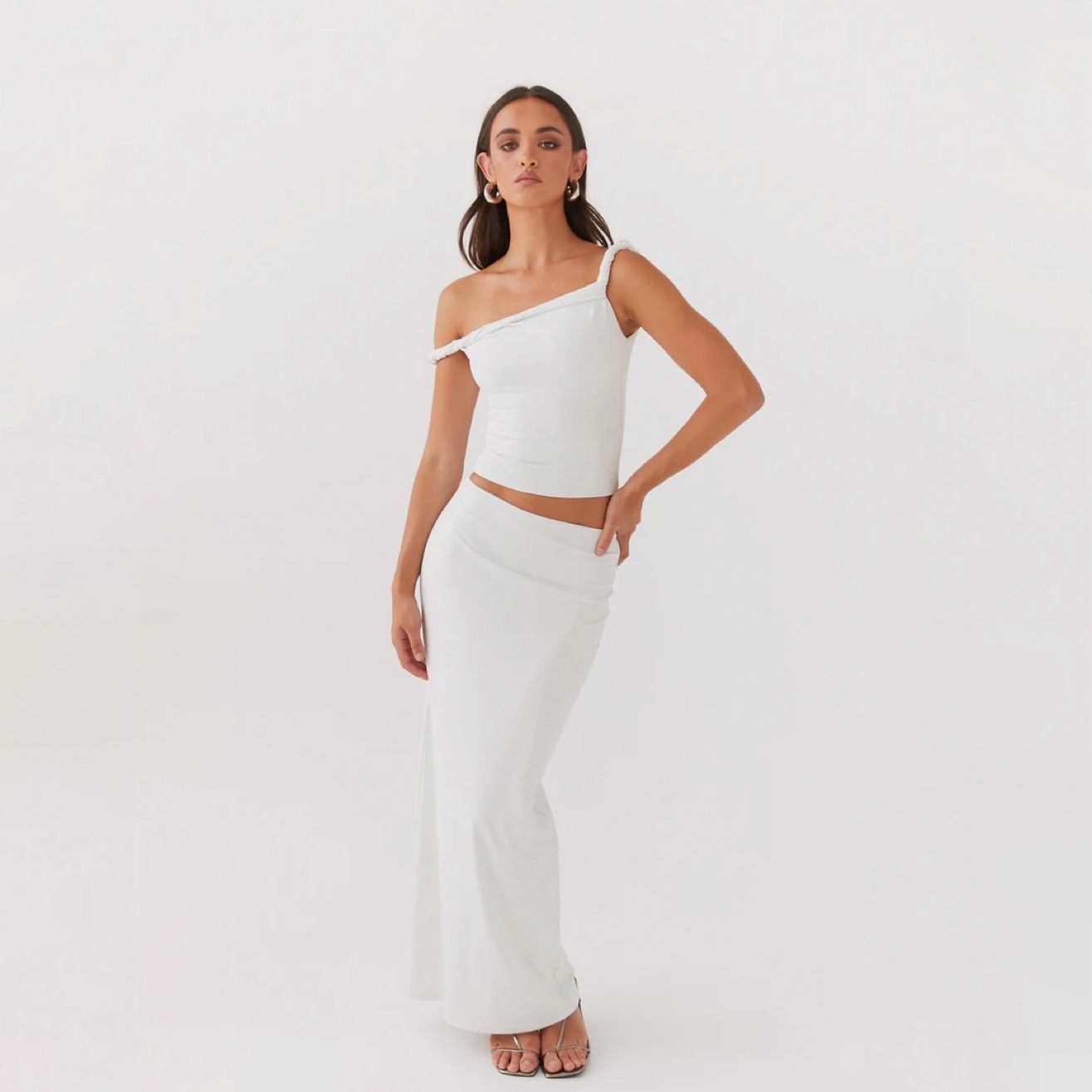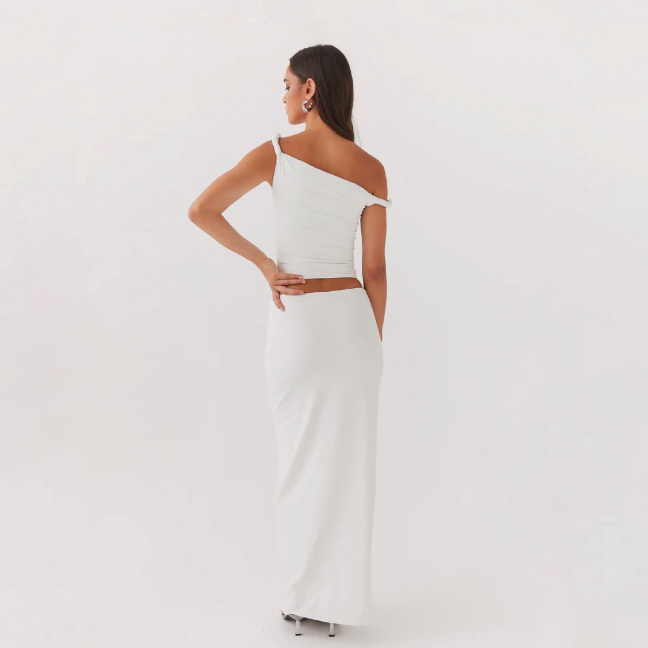 Solace soul twist shoulder top and maxi skirt in ivory from Peppermayo 🕊️ perfect for any summer vacations, brunch parties or day time events! Could be dressed up for night too.