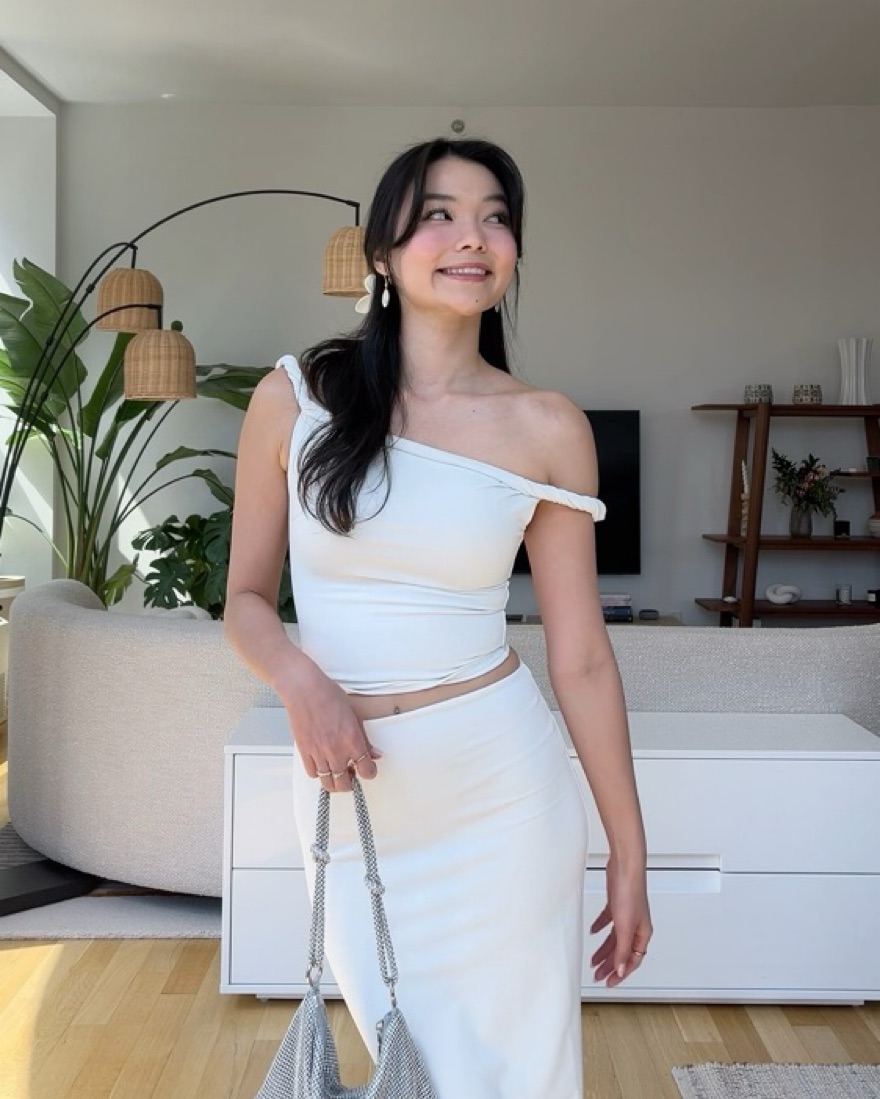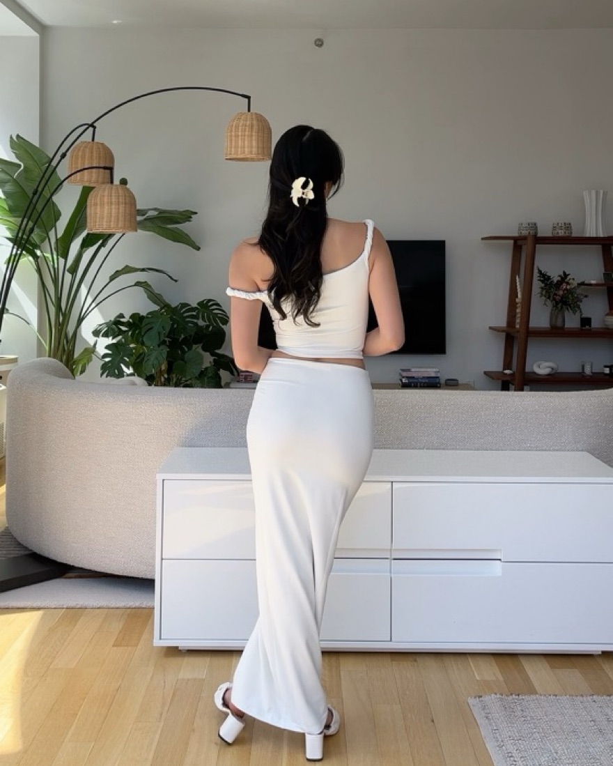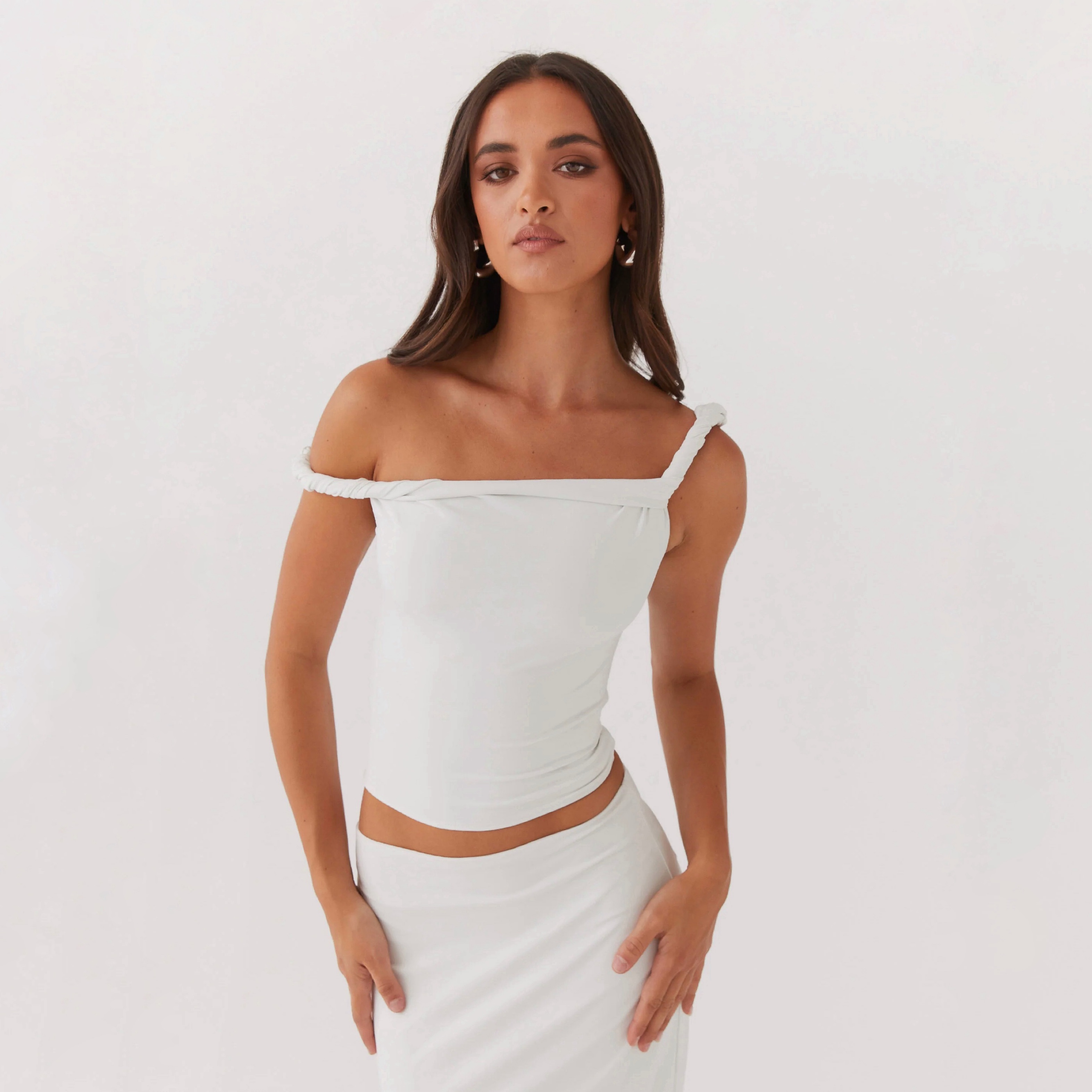 Solace soul twist shoulder top and maxi skirt in ivory from Peppermayo 🕊️ perfect for any summer vacations, brunch parties or day time events! Could be dressed up for night too.