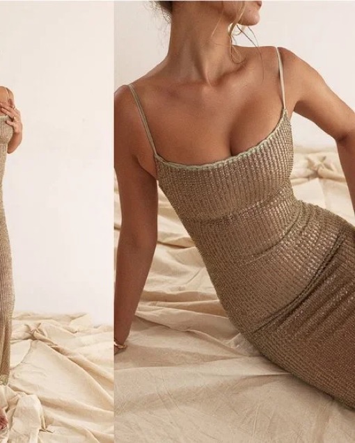 Fits sizes S-M, A stunning, form-fitting midi dress in a luxurious metallic knit fabric. Perfect for a glamorous evening event.