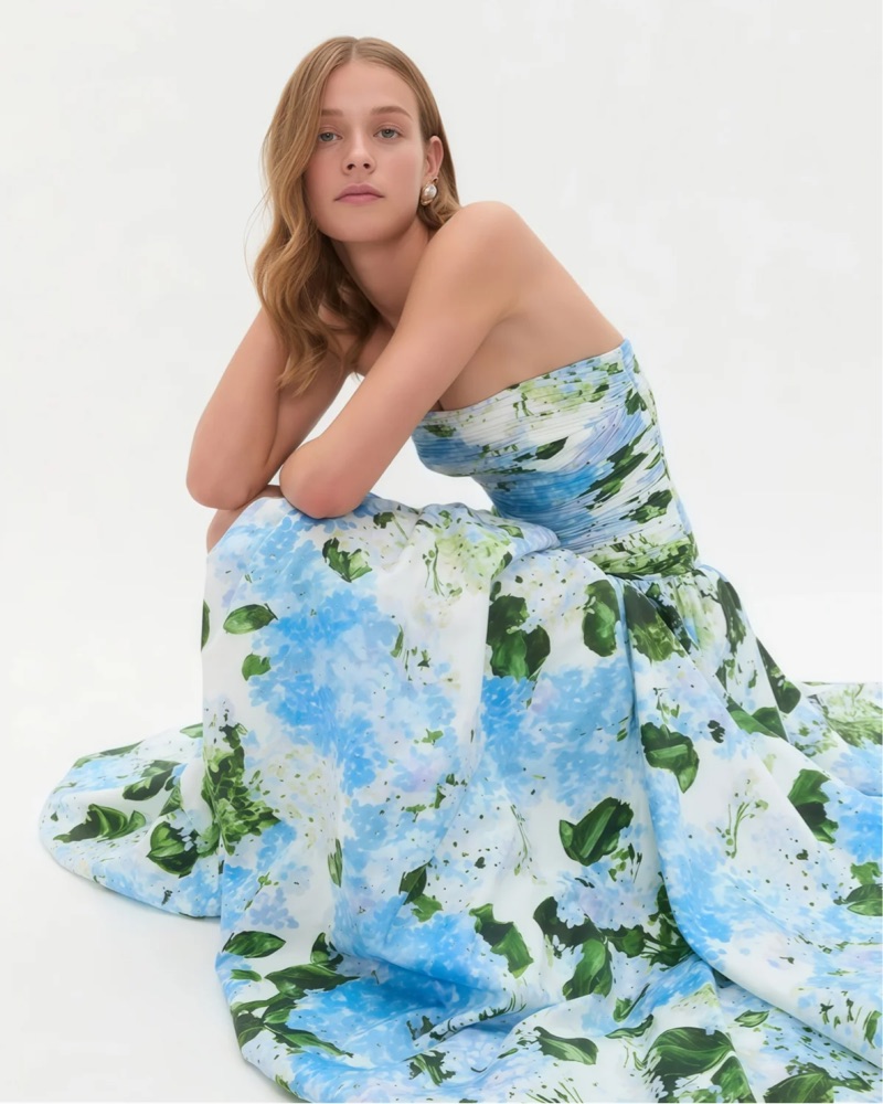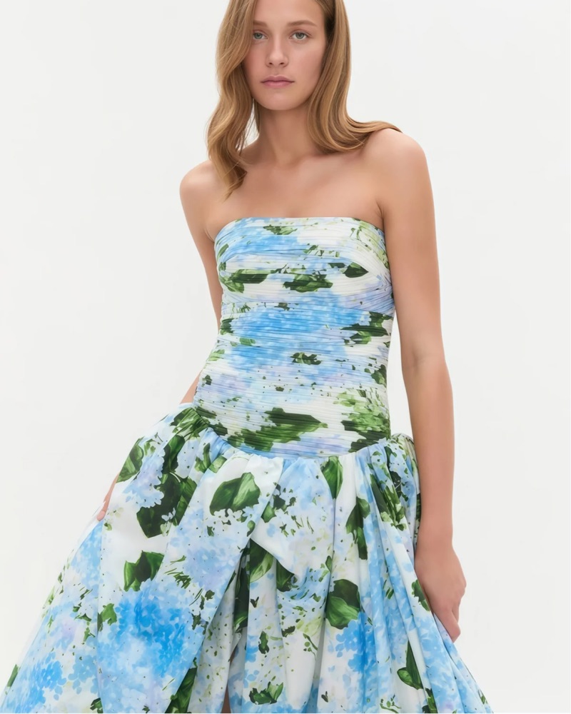 This eye-catching midi dress is perfect for a garden party or summer wedding. The vibrant floral print and flowing silhouette create a chic and feminine look.
