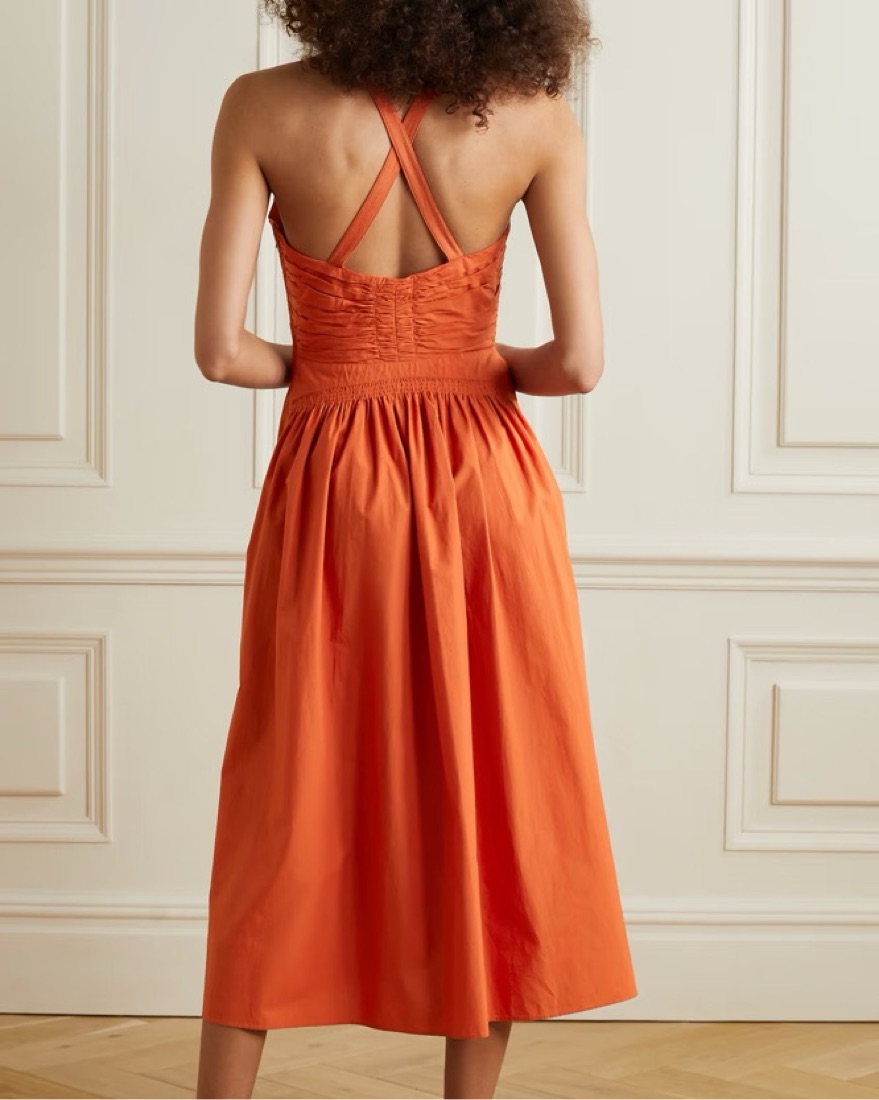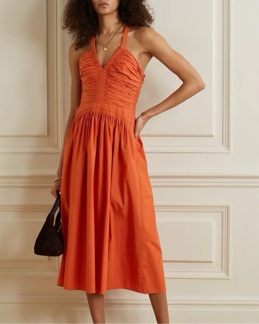 Orange, midi length, cotton poplin material. Sorry I don’t have a better quality pic