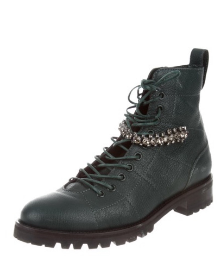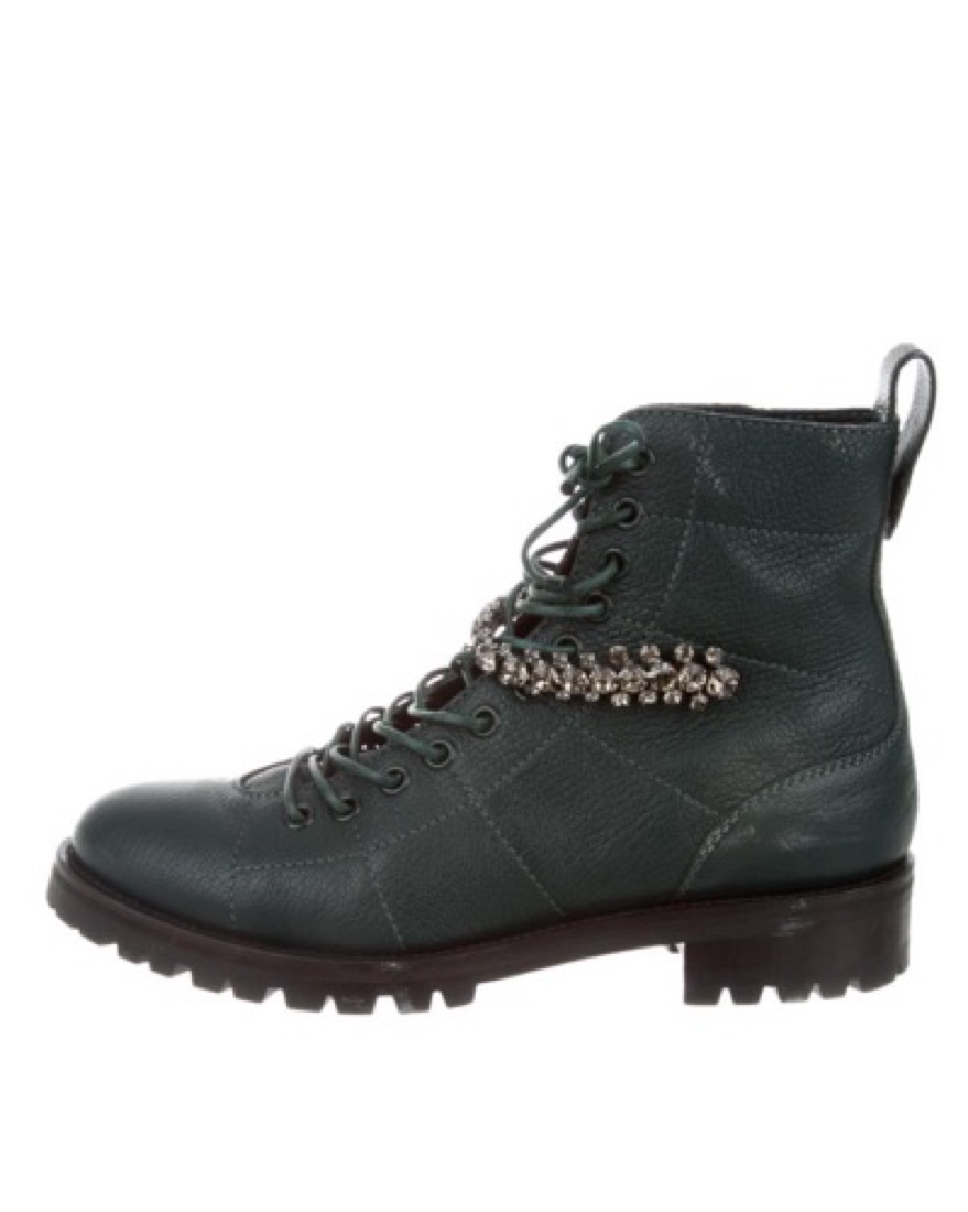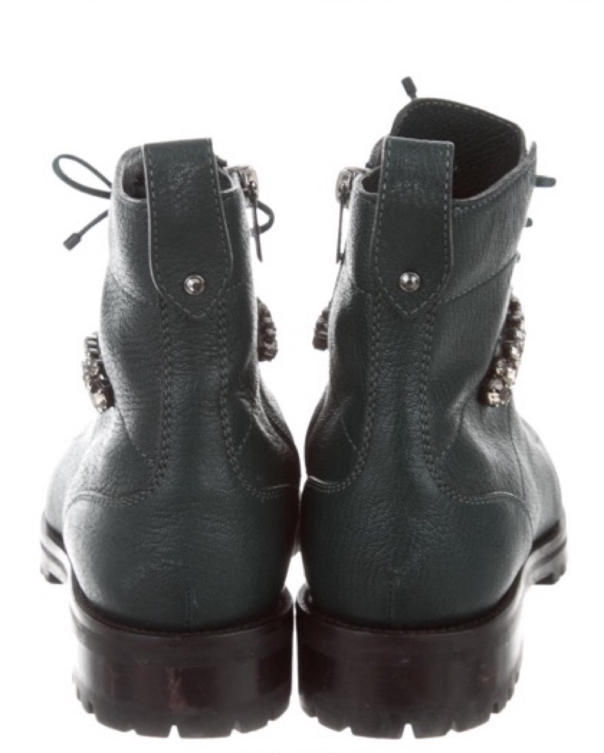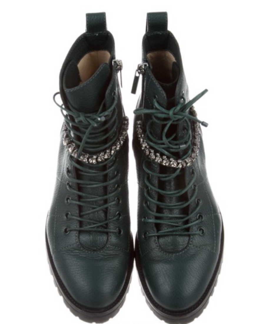 Deep emerald leather Jimmy Choo Cruz round-toe combat boots with crystal embellishments at uppers, stacked heels, lace-up closures at uppers and zip closures at insteps.