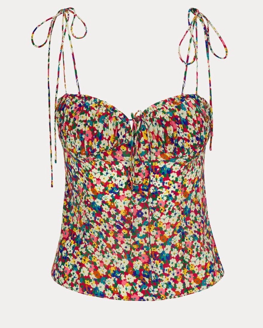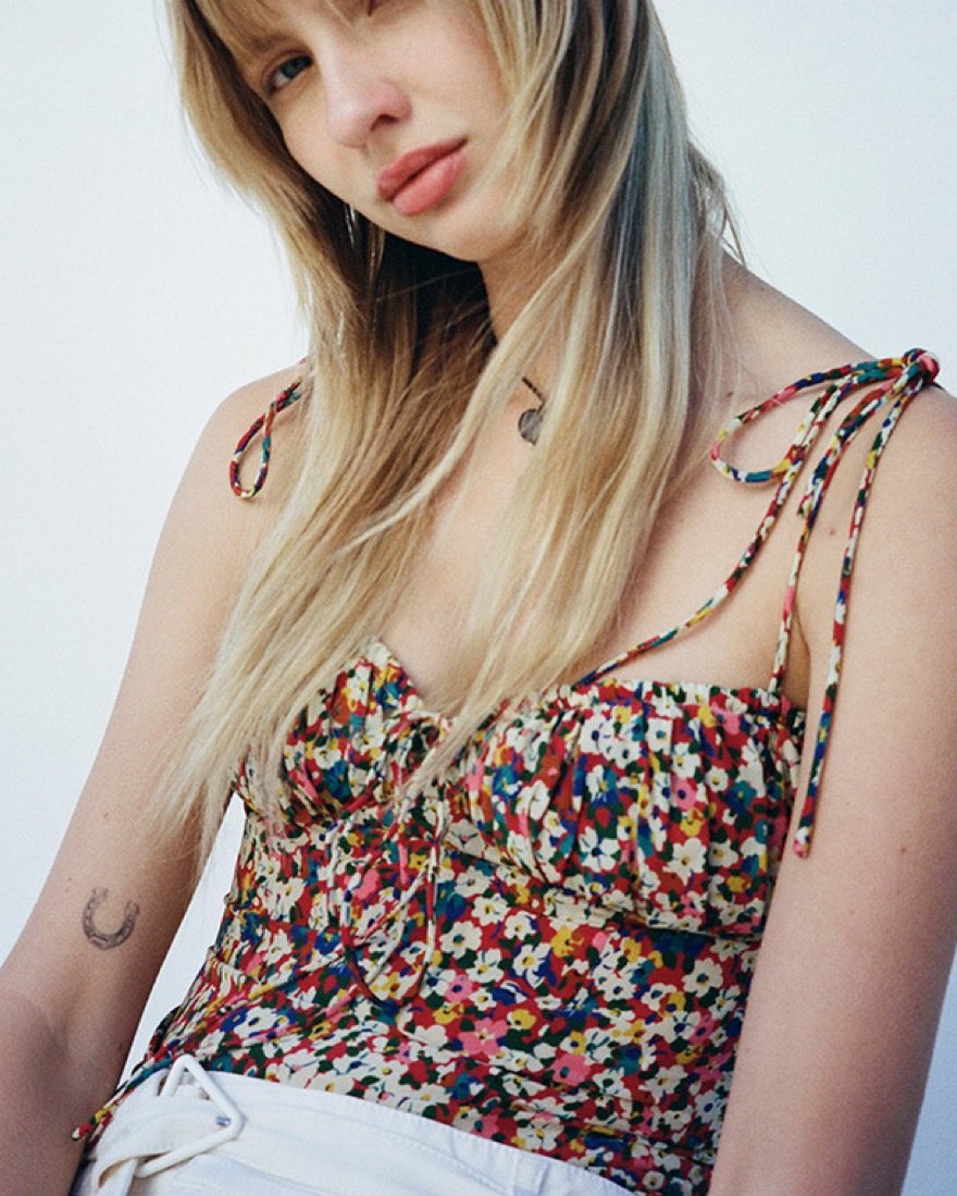 Size S. Réalisation Par ‘The Ana’ bustier camisole top in printed silk. Straps and front tie are adjustable for a perfect fit! 💐