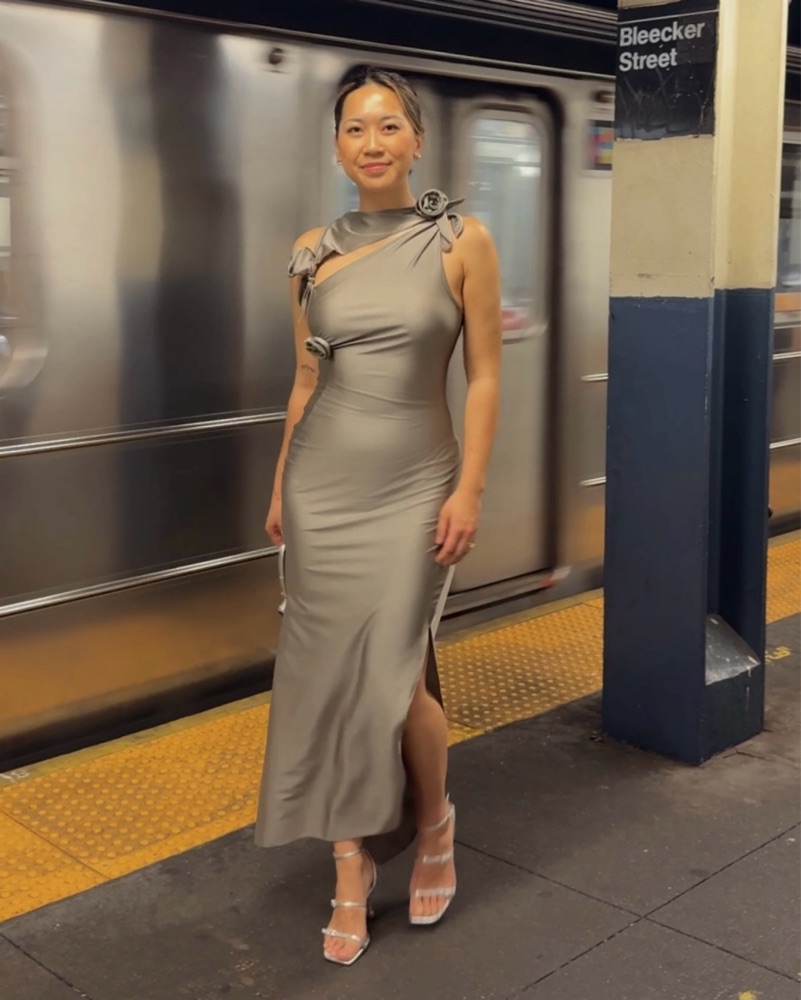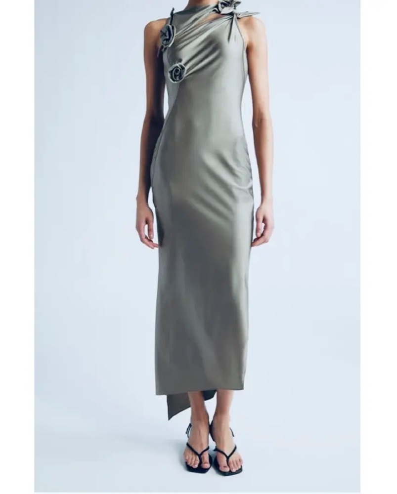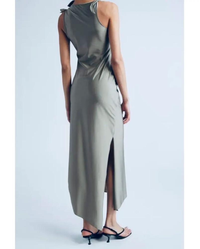 Perfect condition and fits sizes XS-M given the stretchy nature. Beautiful color that has a slight metallic nature to it. Cut with a subtle asymmetrical twist, this figure-sculpting gown is gently ruched and embellished with a deep front slit.