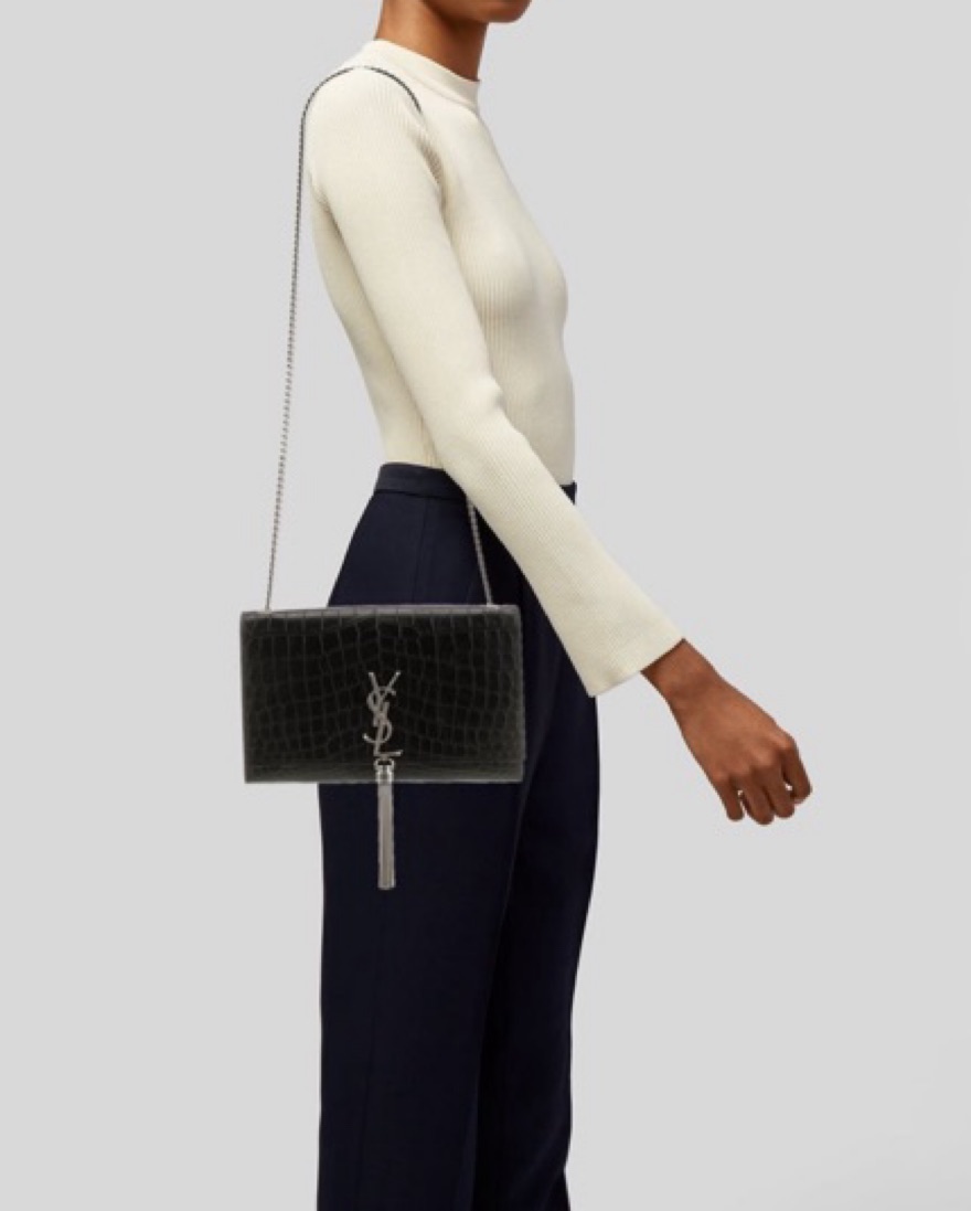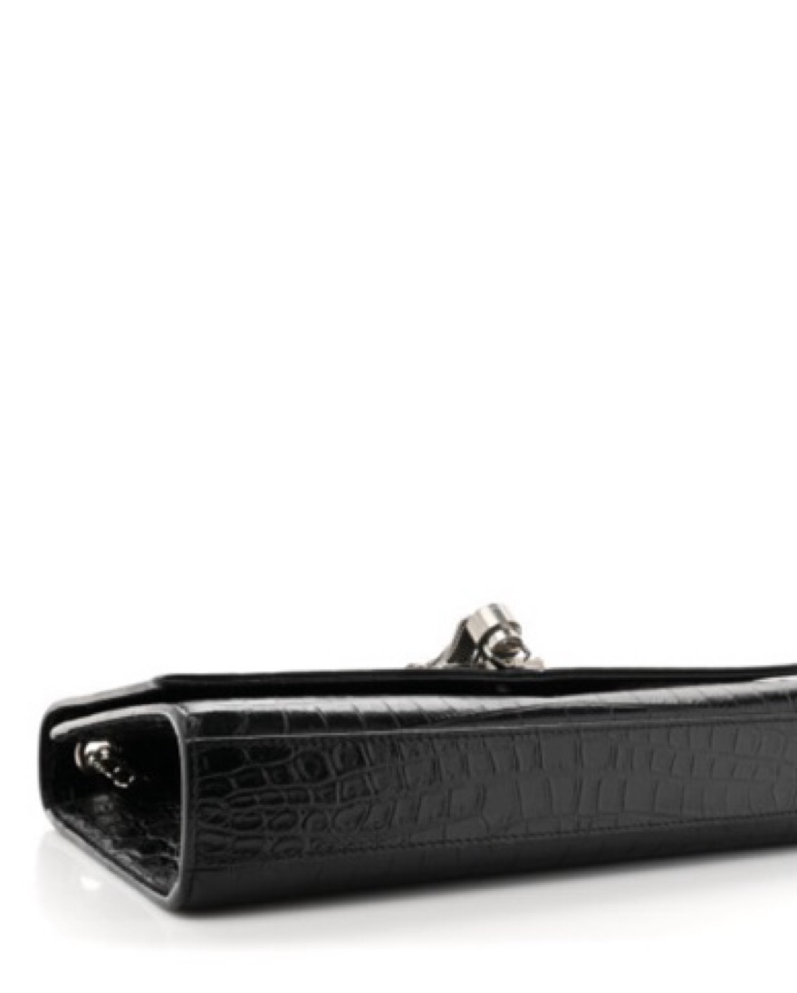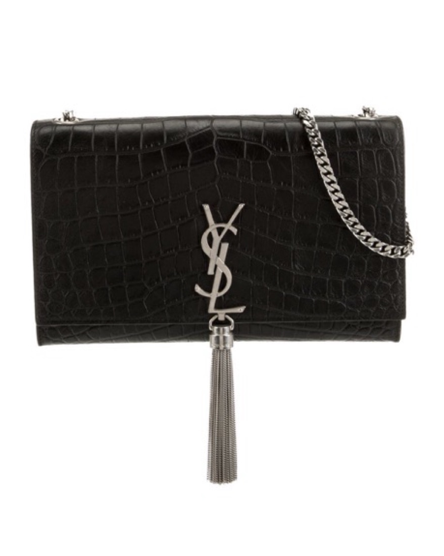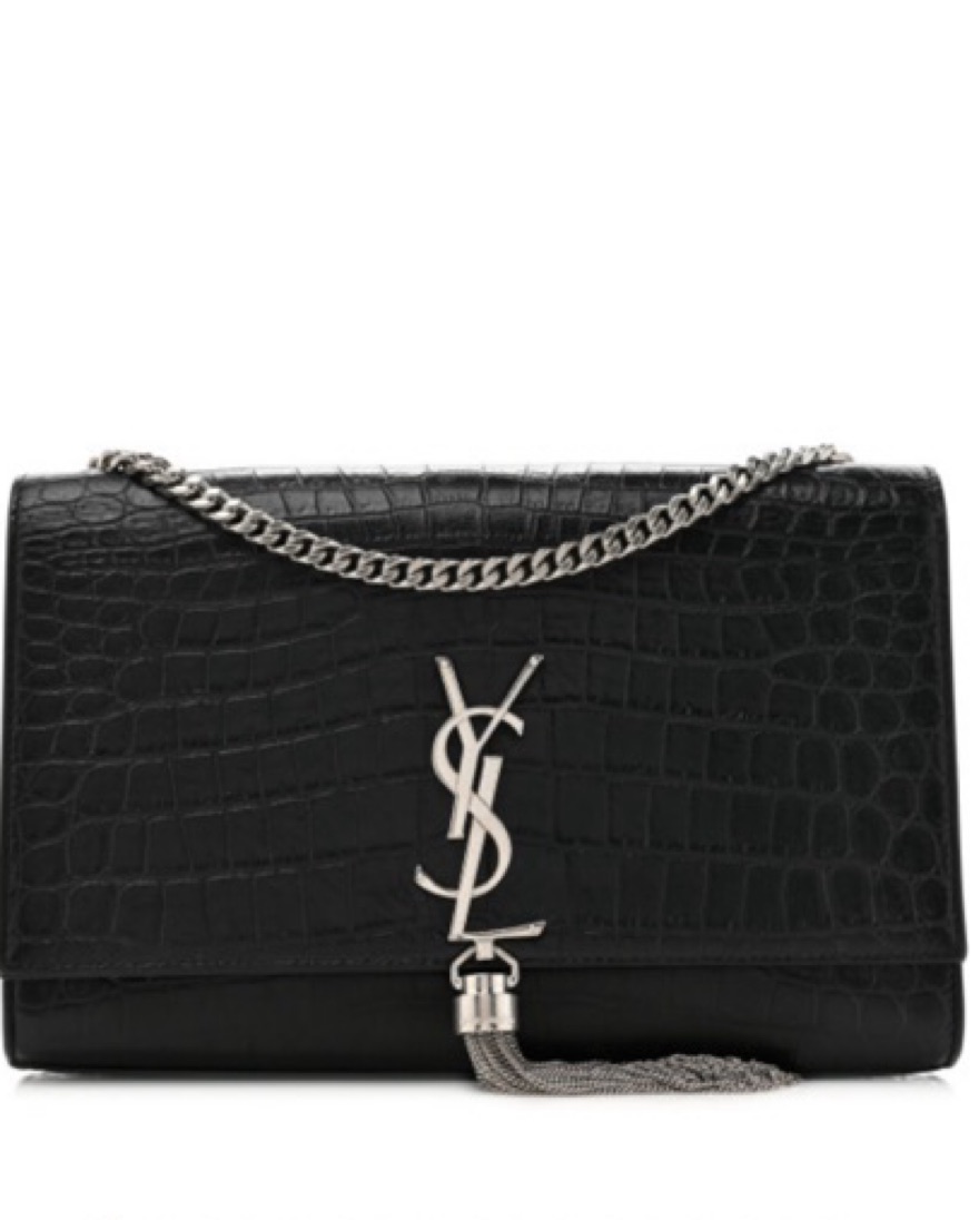 YSL Kate black croc embossed leather with silver chain and tassel