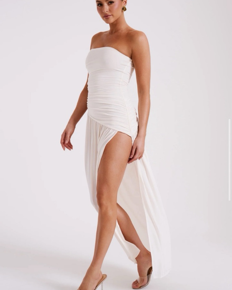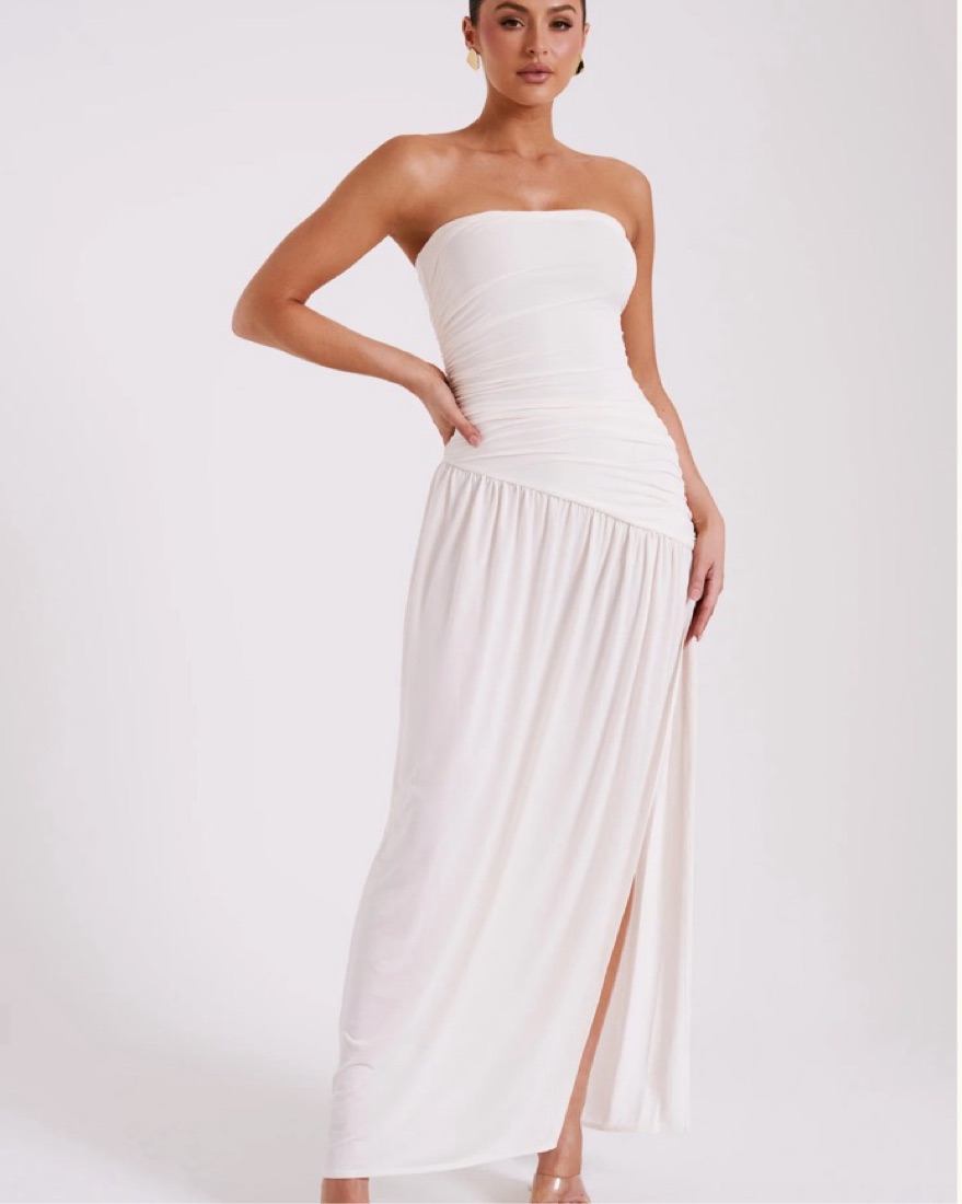 STUNNING. fits like a glove, stays up and is so comfortable. I am 5’4 and it comes down to the floor so it’s longer on me than on the model and you have to be careful because it’s white obviously.