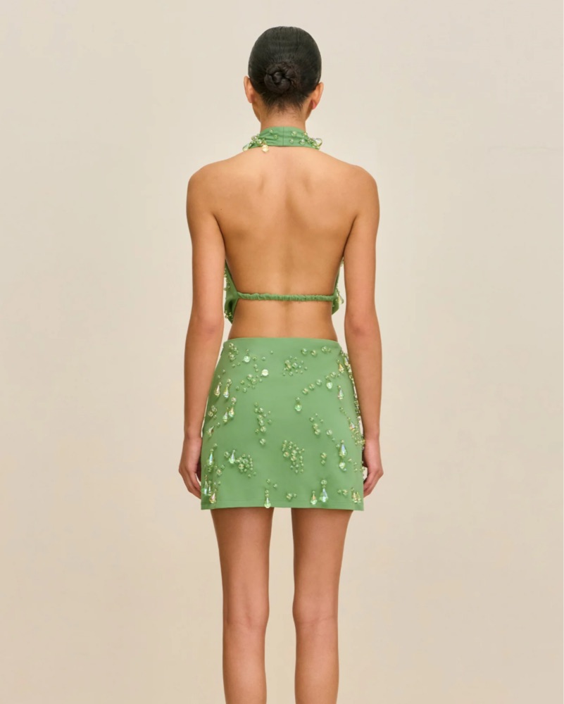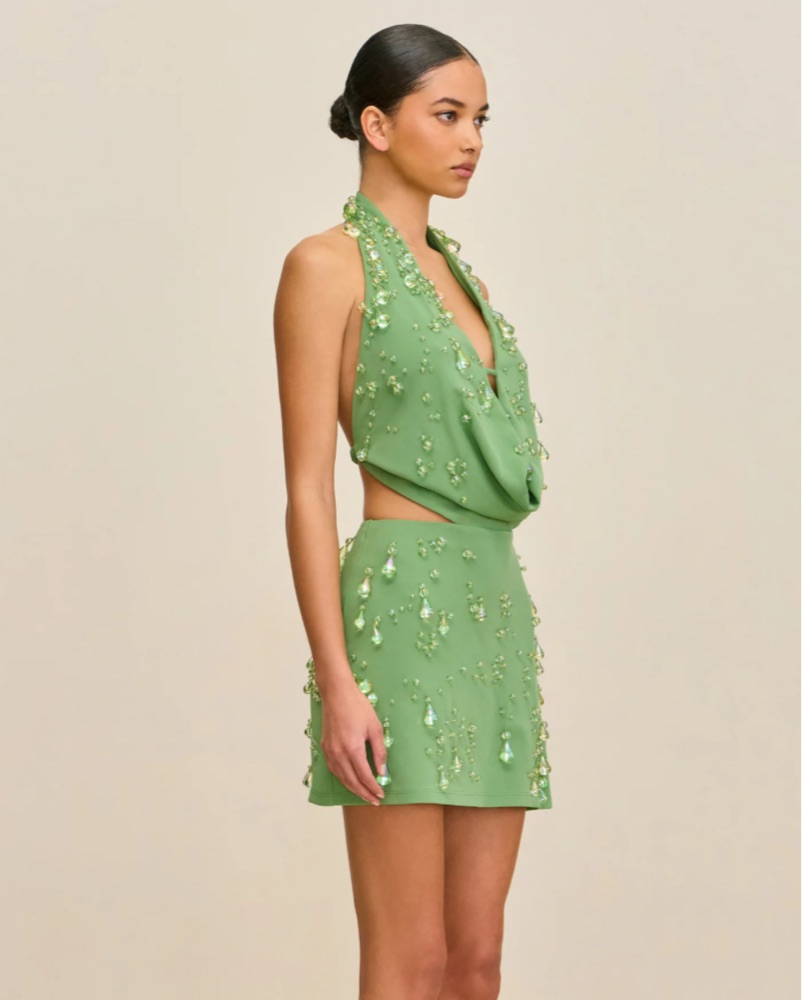 An adorned cowl-neck mini dress with droplet-shaped iridescent glass beads and open back.