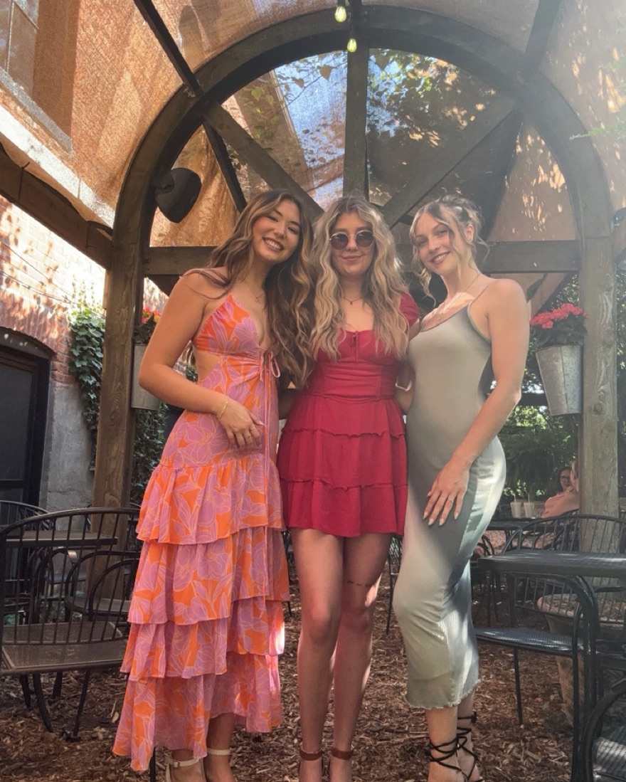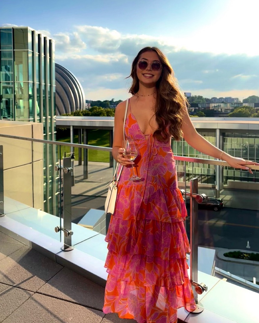 Dress is from a local boutique. A purple and orangish flower pattern dress. Not stretchy fabric but the back is lace up so definitely adjustable