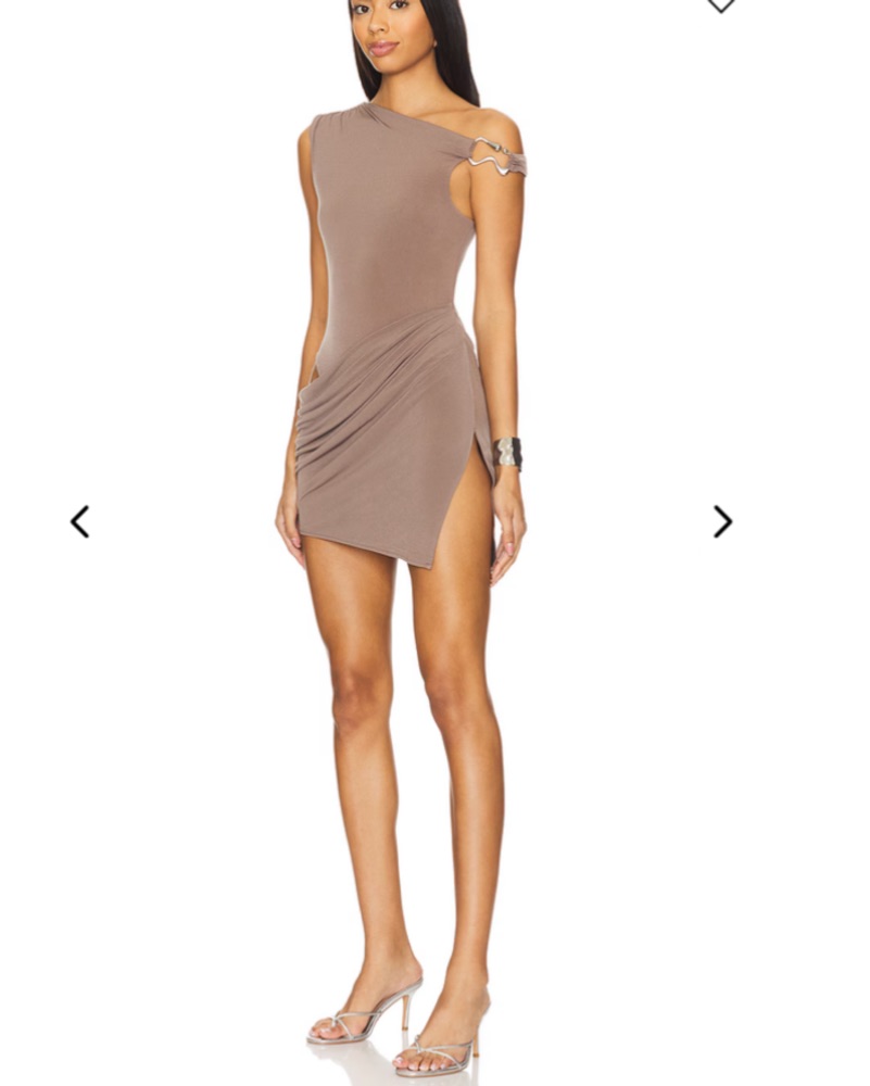 gorgeous taupe NBD Arleth Mini Dress from revolve. skirt draping and silver hardware up top. Fits a S/M.