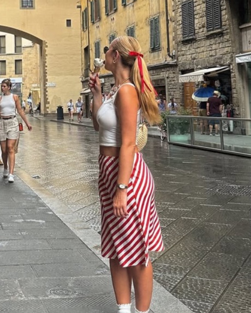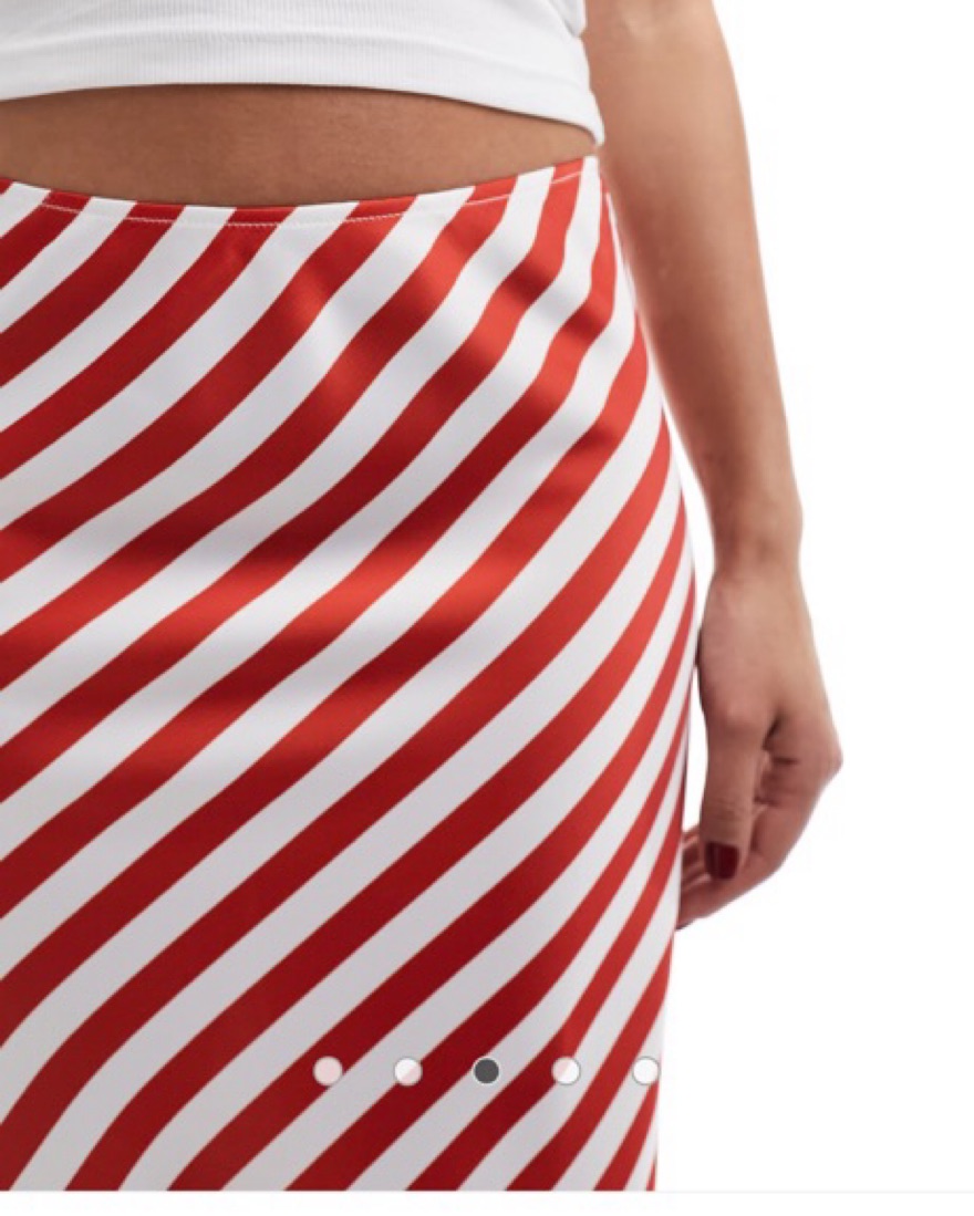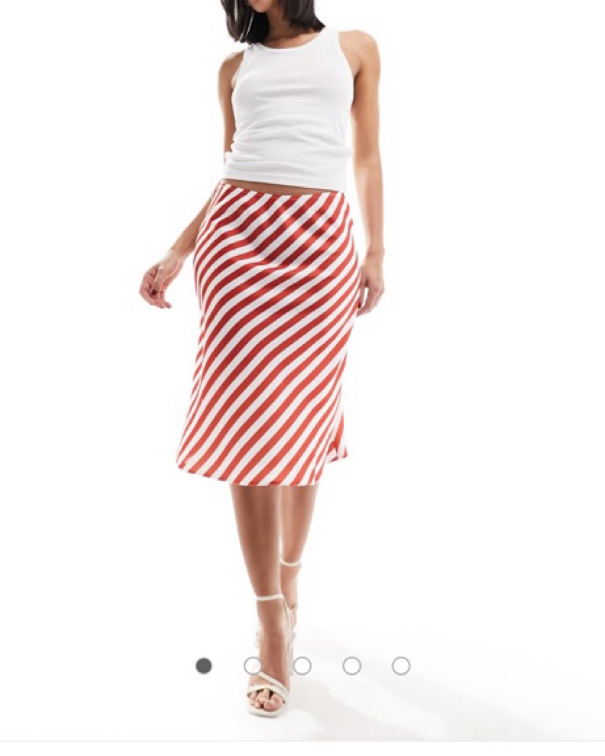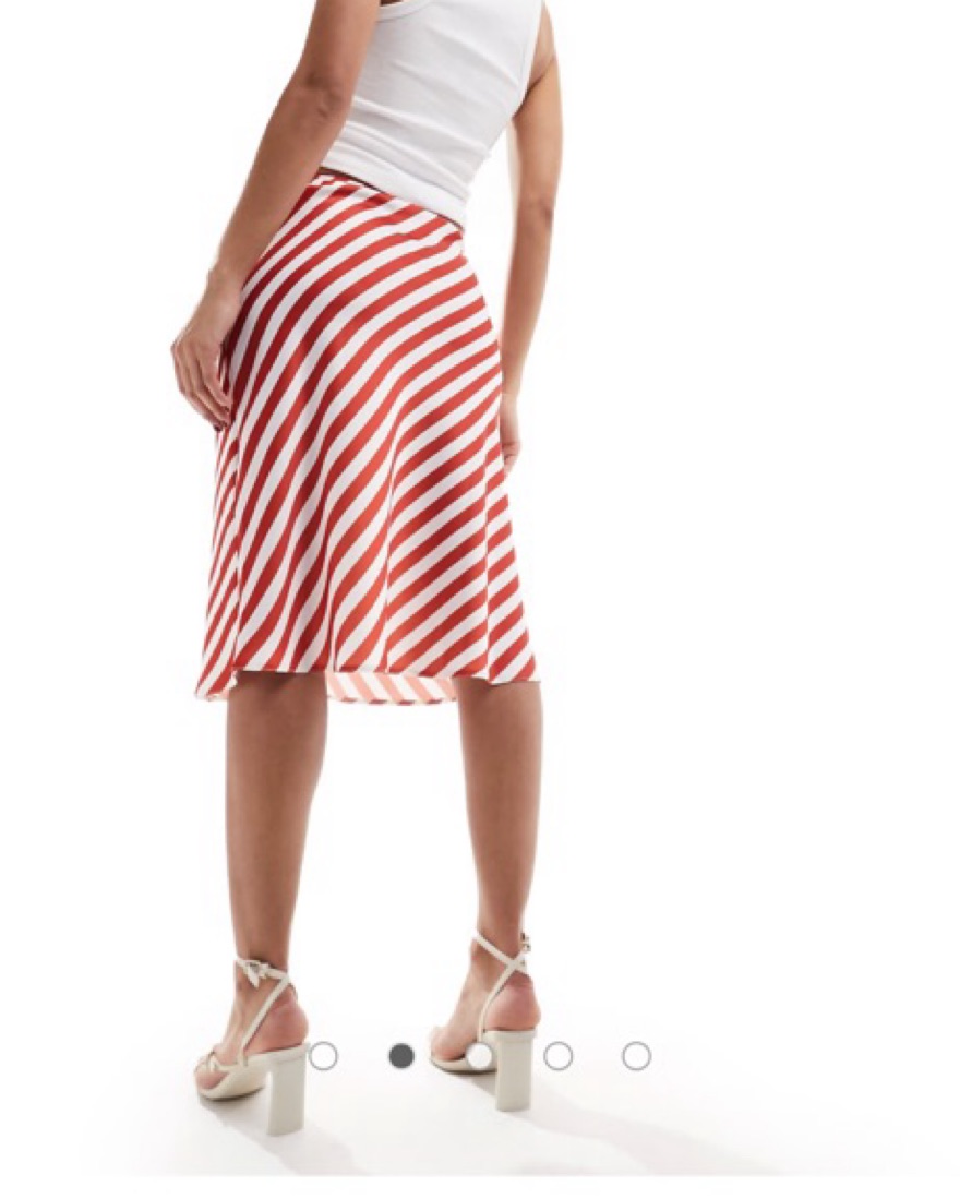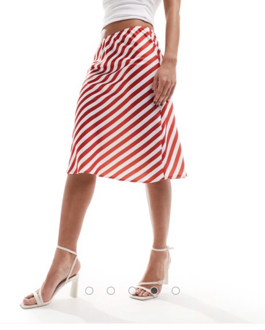 ASOS DESIGN knee length satin skirt in red stripe print. This bold, striped midi skirt is perfect for a fun summer day or evening out. The vibrant colors and flattering silhouette make it a versatile piece that can be dressed up or down.