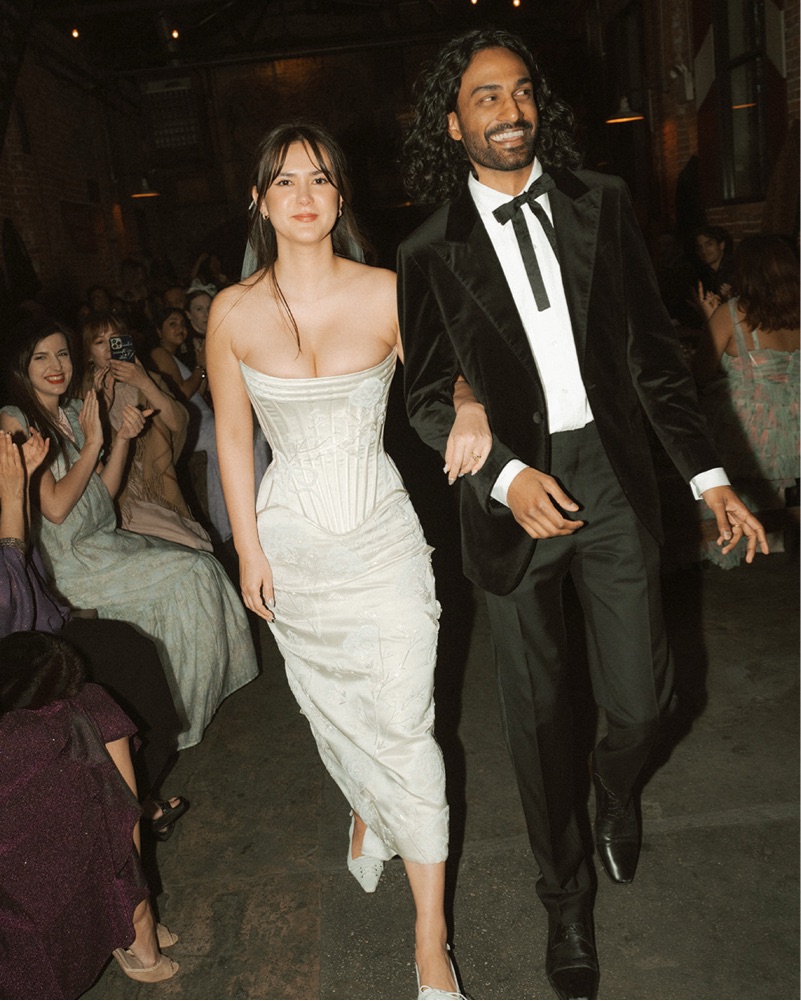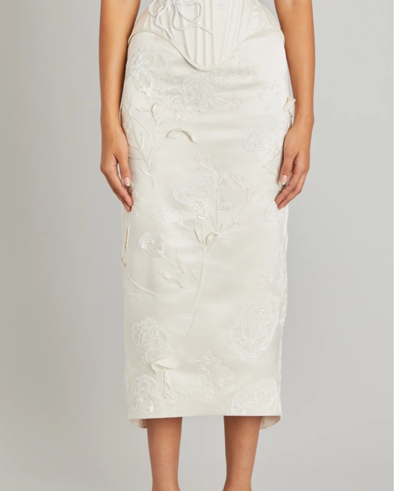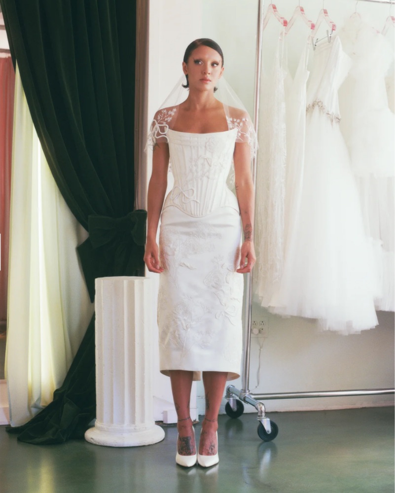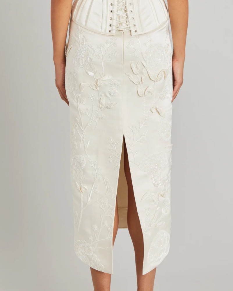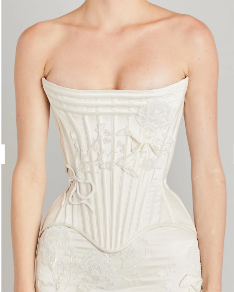 New York based designer Wiederhoeft’s Wasp corset and skirt with carnation embroidery. This wedding dress strikes the perfect balance between classic, edgy, and romantic. Plus, it snatches your waist and makes the girls look amazing. Wedding dress size 8, equivalent to S-M. Original price $8500