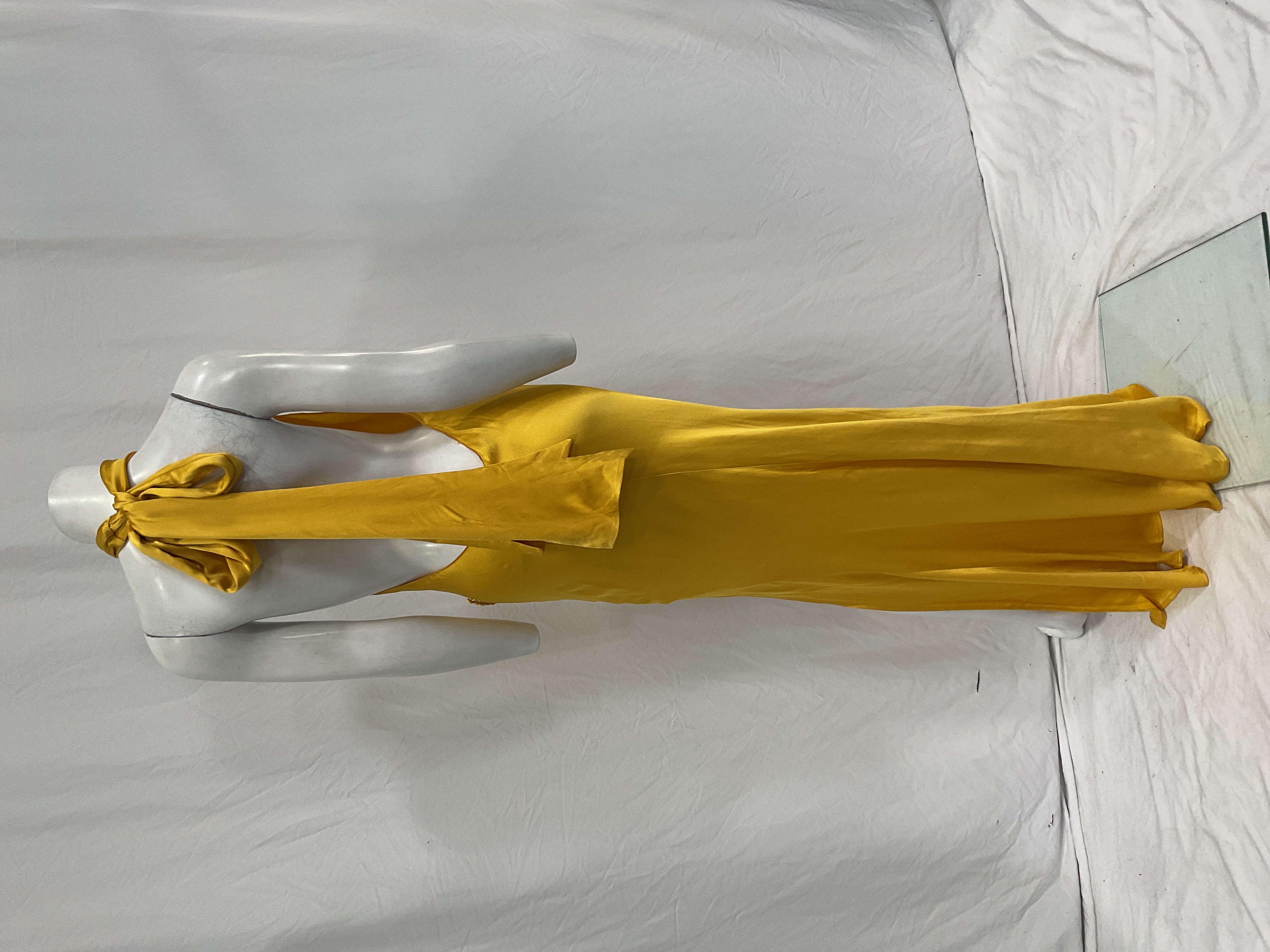 Luminous gold fabric makes a stunning statement at weddings and galas. Elegant silhouette flatters your figure while turning heads all night.