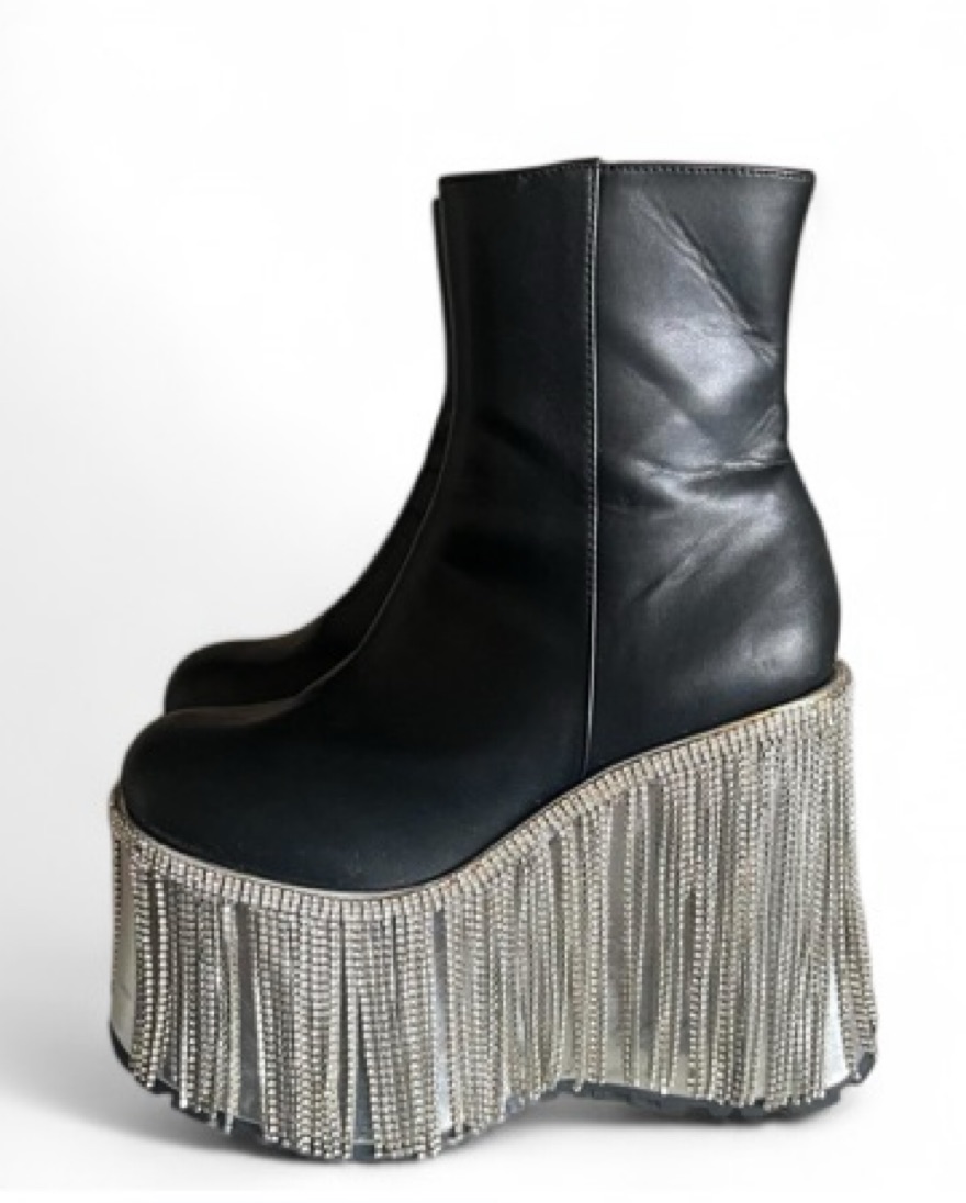 “Diamond” Fringe Platforms purchased secondhand but originally from Dollskill. US women’s 8. Missing some fringe on one platform but can be easily fixed/replaced. There may be scuffing present throughout.
