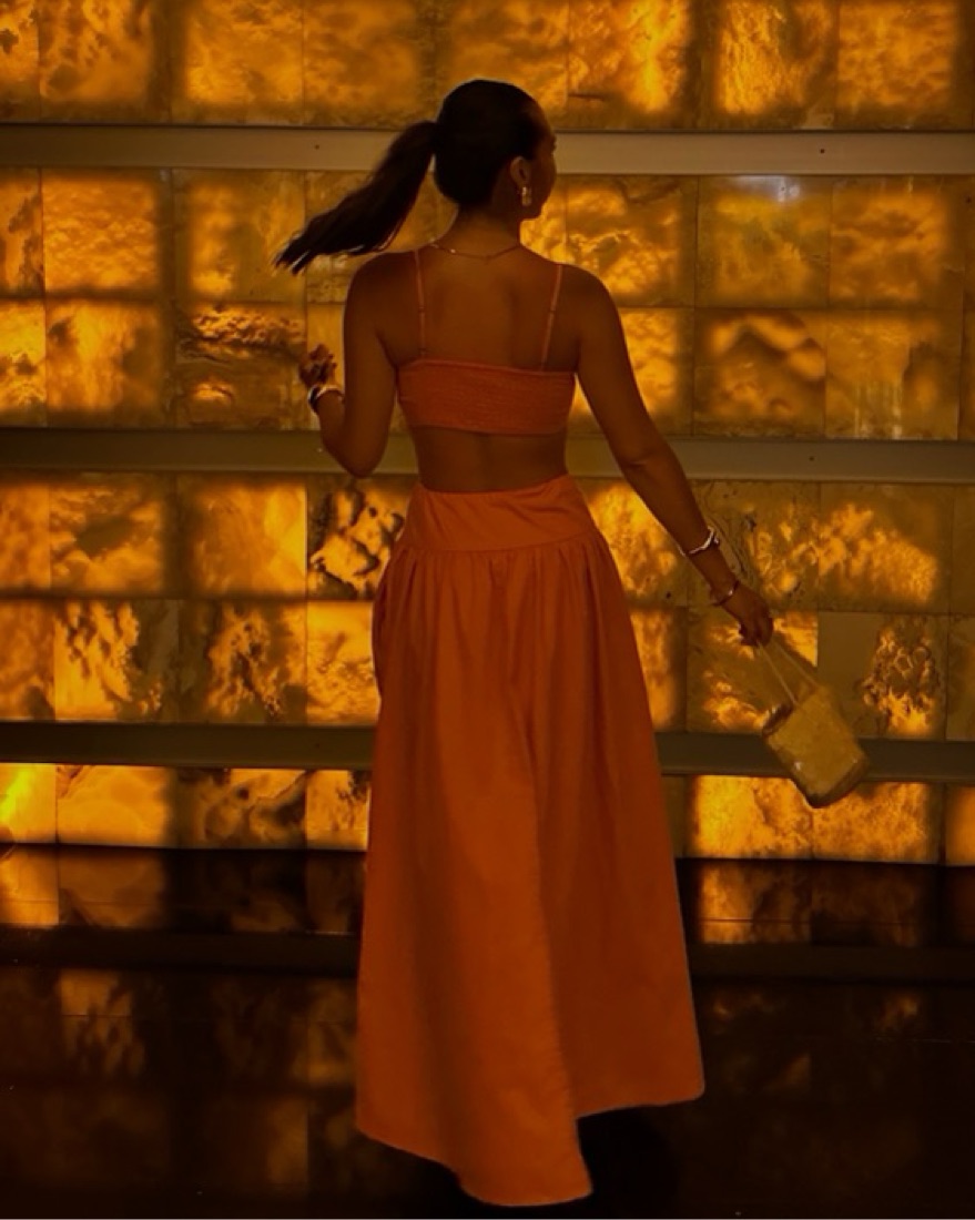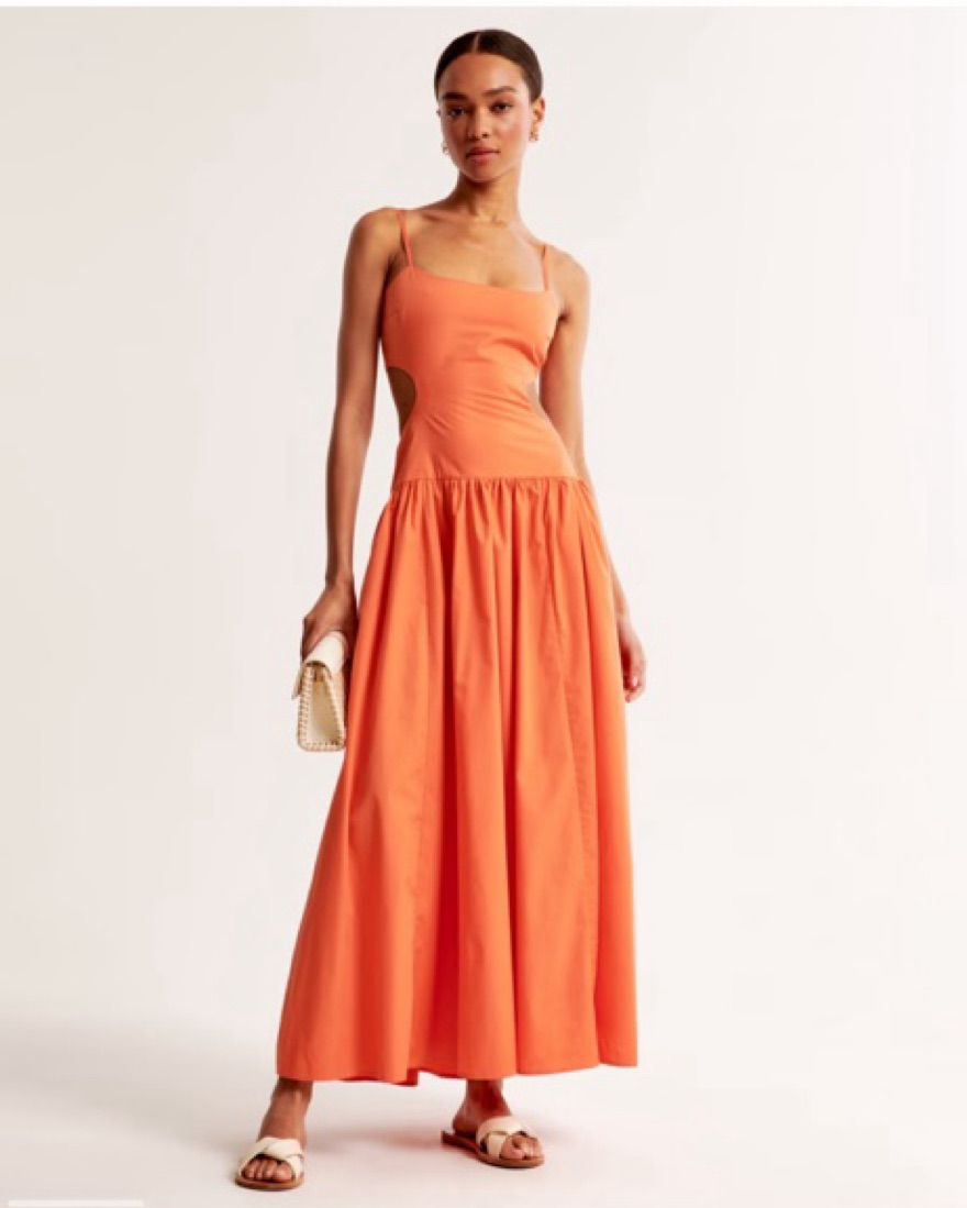 The prettiest shade of orange! Maxi Dress, trendy side circle cutouts, flattering dropped waist detail and a volume skirt with pockets
