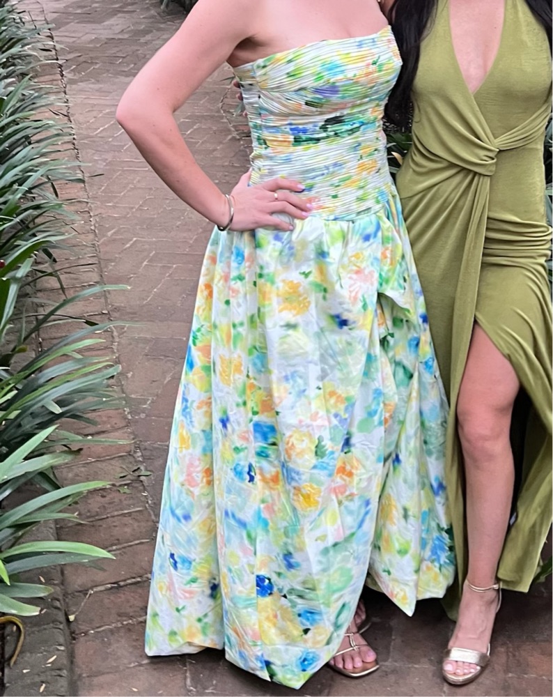 This stunning floral dress is perfect for a wedding. The vibrant colors and flowing silhouette create a beautiful, feminine look. Worn only once!