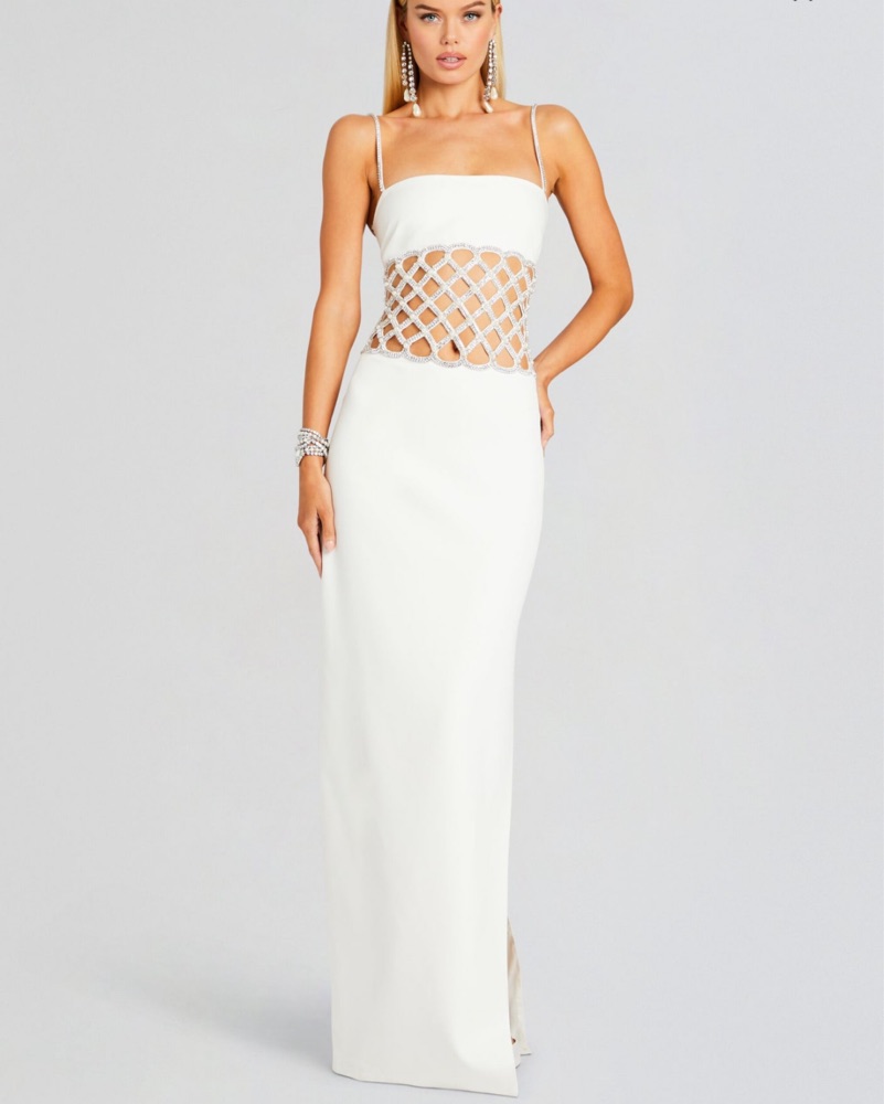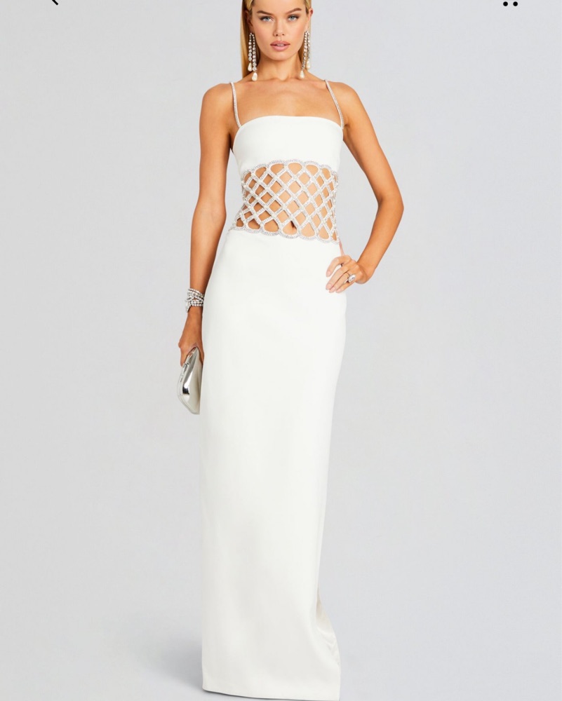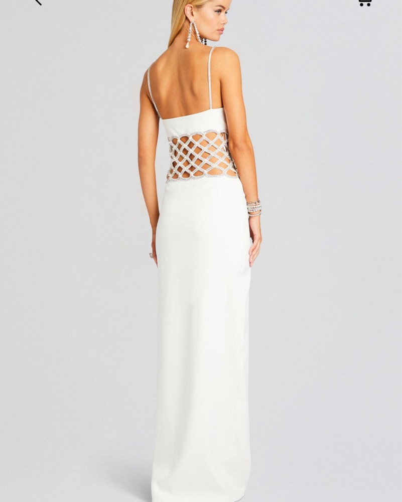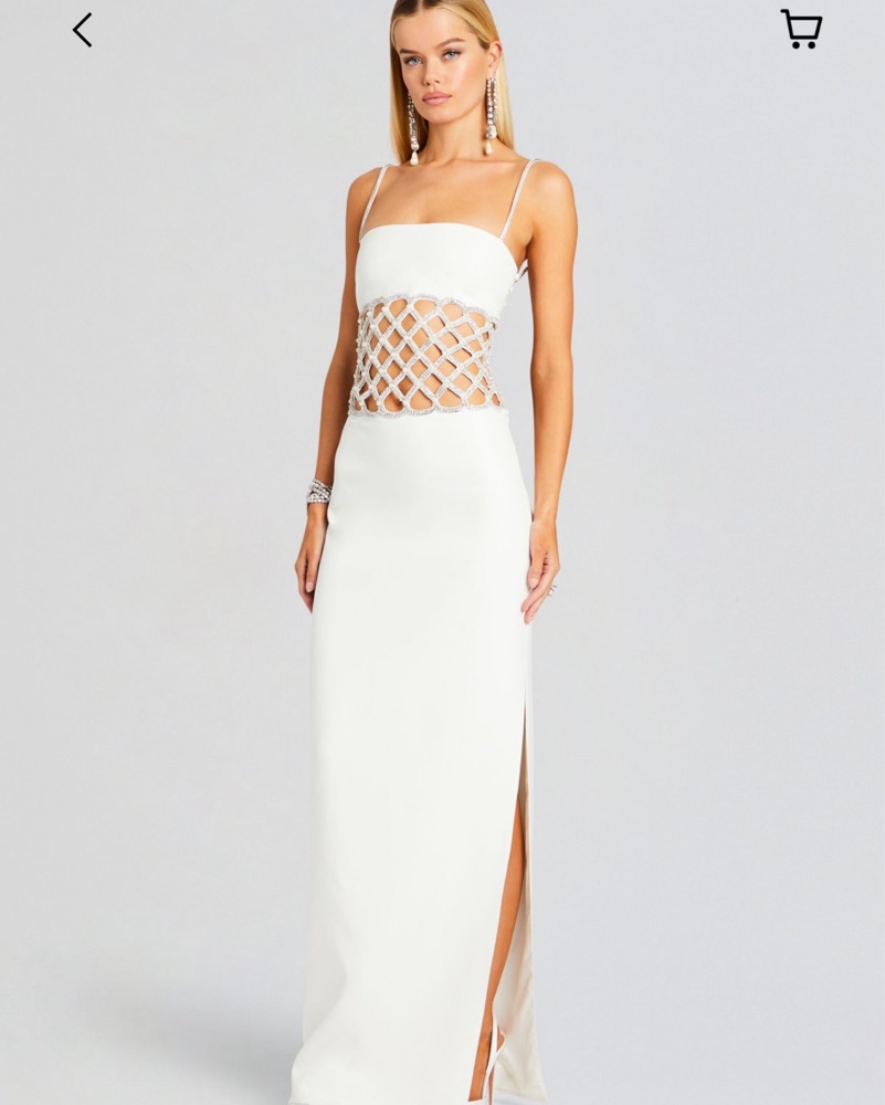 This stunning maxi dress is perfect for a formal occasion. The figure-flattering caged waist detail and high slit add a touch of glamour. Custom made- fits size 4. I am 5’3