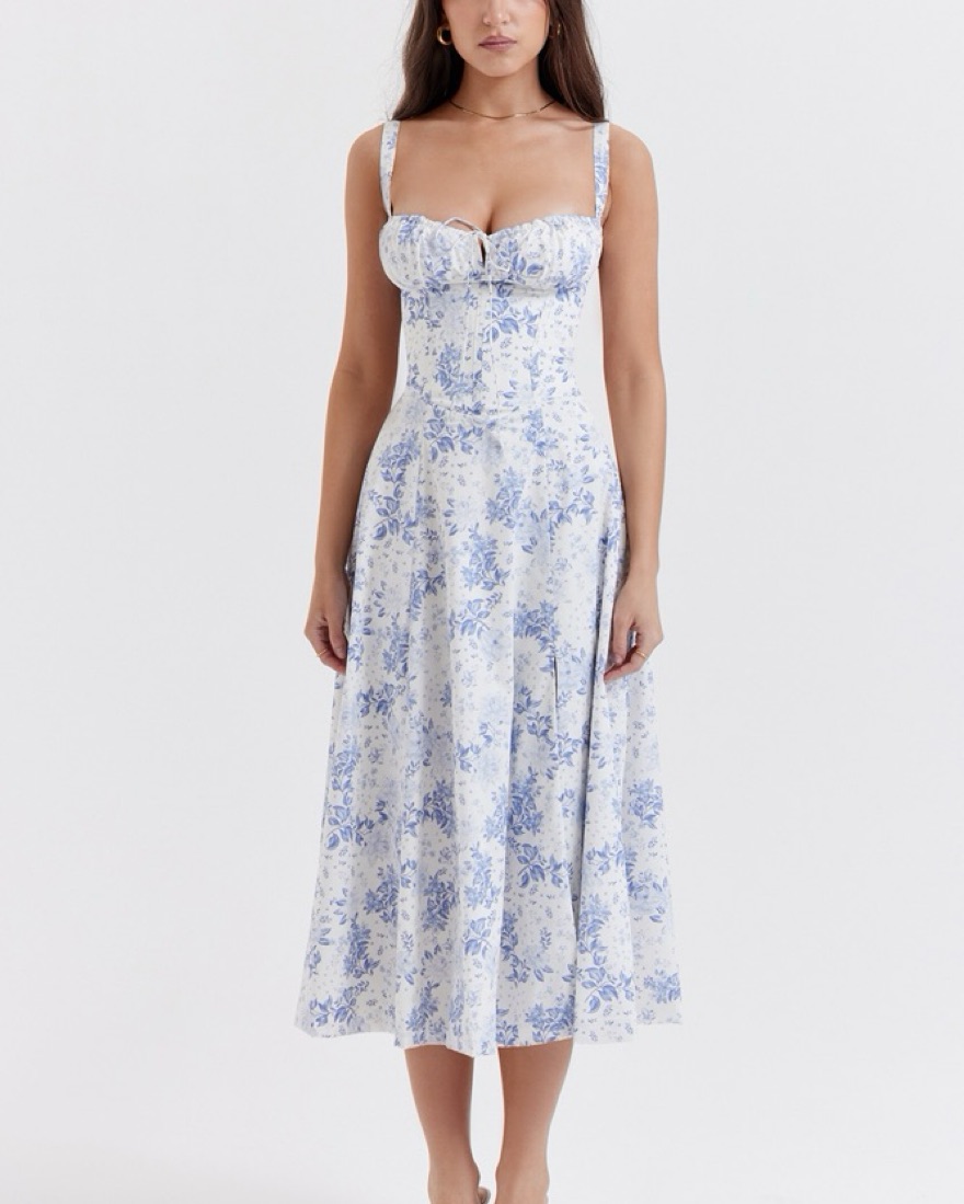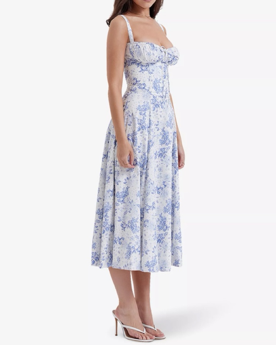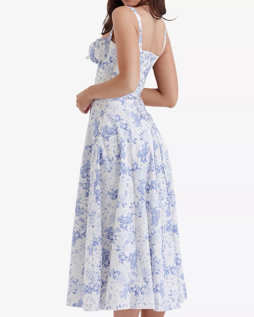 Ultra feminine 'Carmen' dress cut from stretch cotton in a gorgeous blue print hue. Corseted bodice to cinch the fit with a beautiful lace up back. The gathered bust has a drawstring tie and the side split.