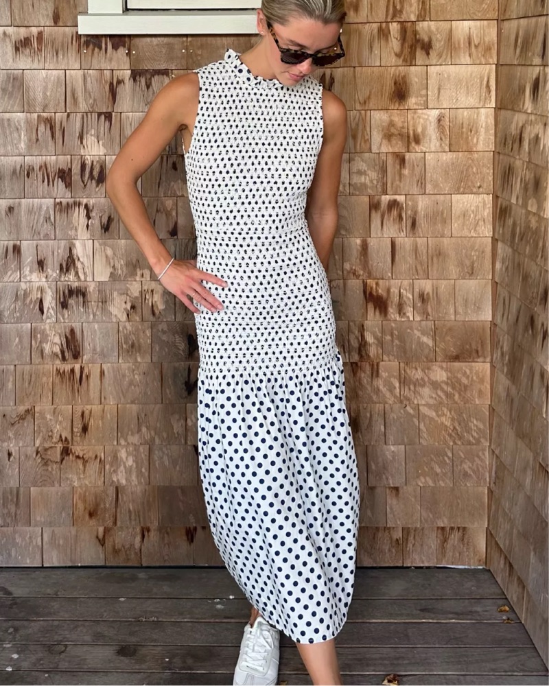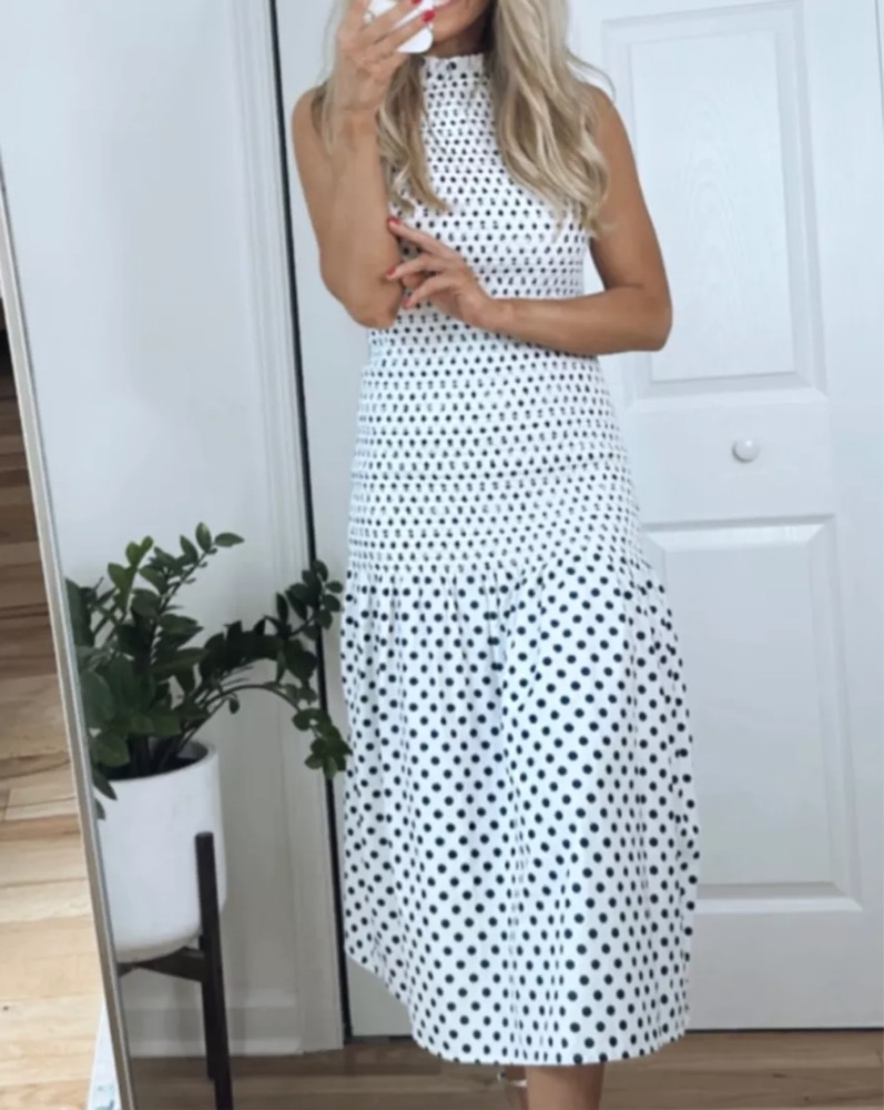 Chic navy and white dotted dress. Very Hamptons. So cute and flattering! No self tan or body makeup.