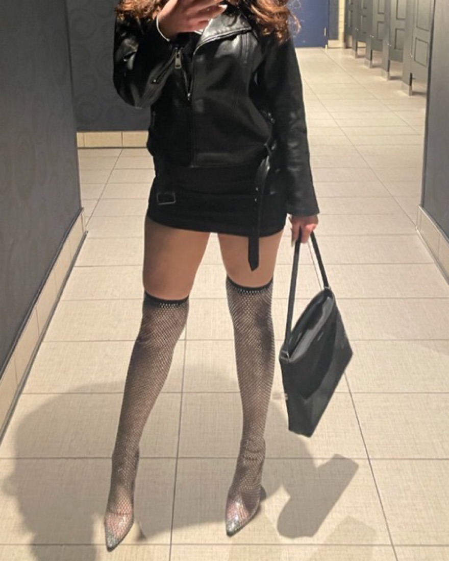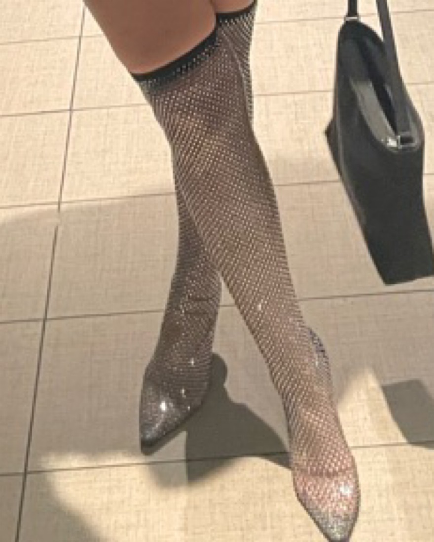 Sexy Mesh boots with small heels, surprisingly comfortable for a night out! Such a look all on their own, can keep the outfit simple to complement the boots, so fun and different