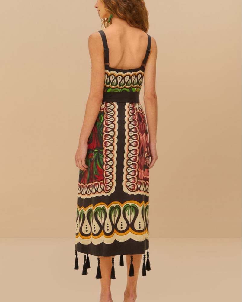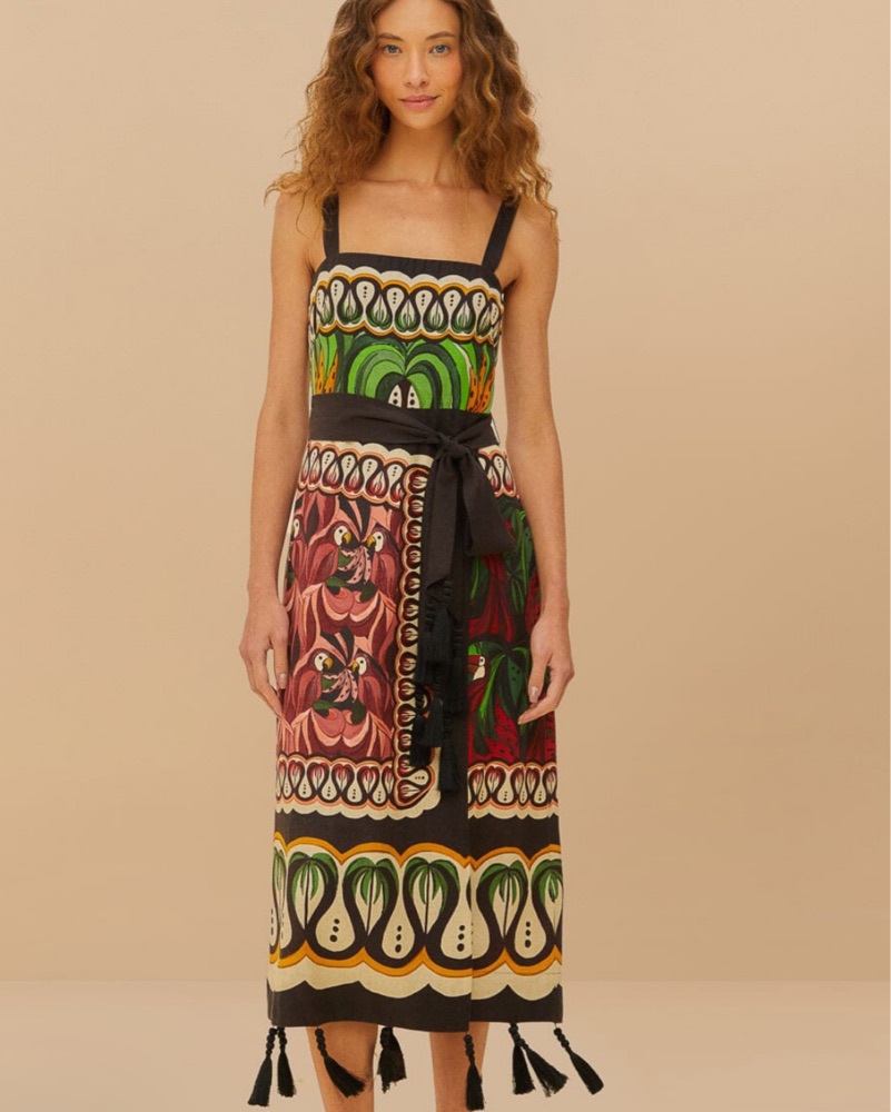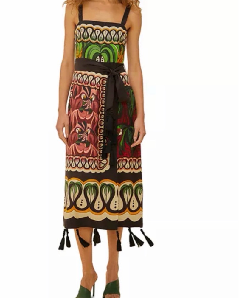 Tropical pattern dress with fringe tassel bottom only worn once. Straight neck with tropical bird and palm tree pattern. Side zip closure. Printed. Tassel trim at hem. neckline. #resortwear #tropical #vacation #tropicalprint #tassels #hawaii
