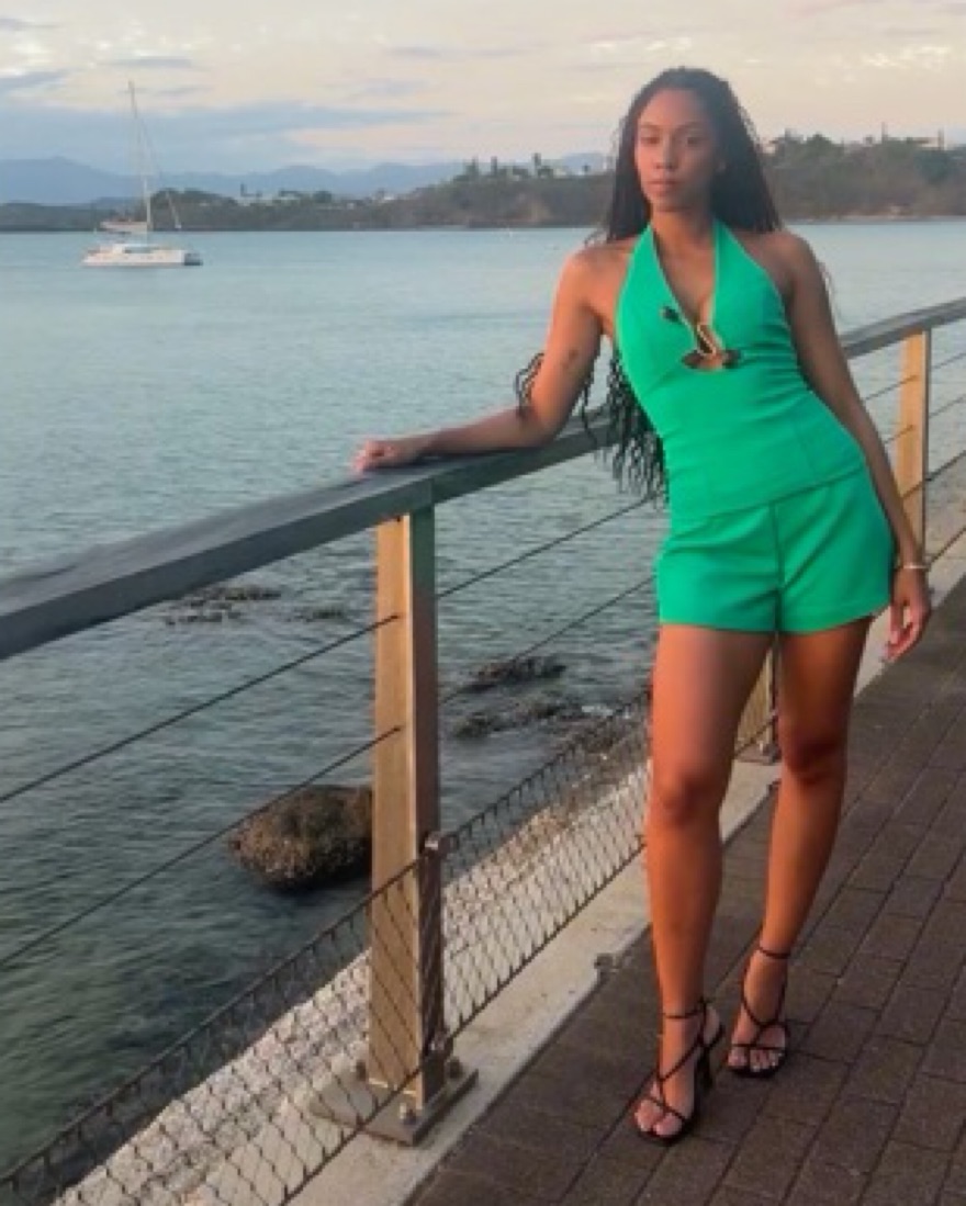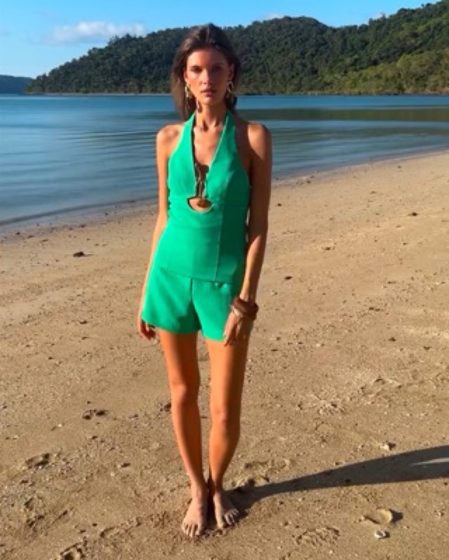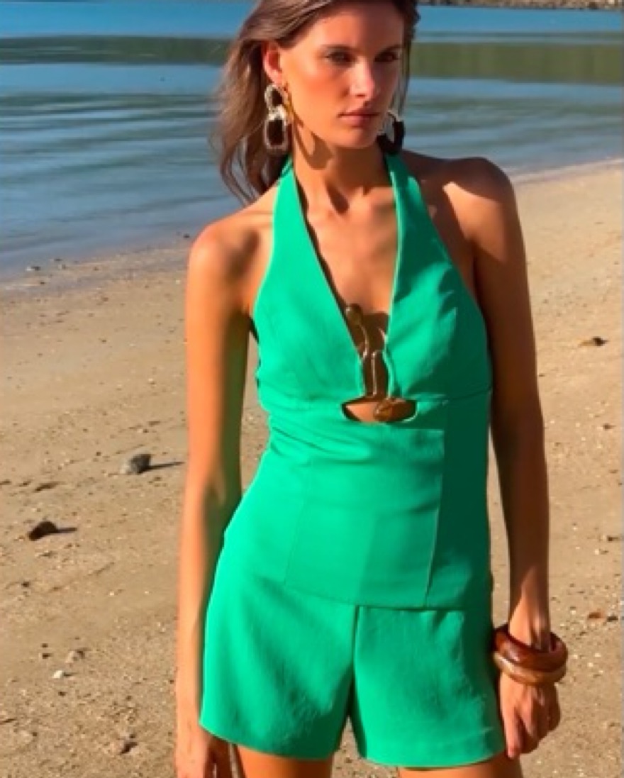Kookai oyster trim halter top and shorts in island green. The halter top is a US size 2 and the shorts are a US size 4 as I like the top to be a bit more fitted.