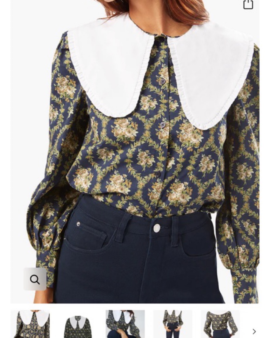 Collared blouse with beautiful print. Perfect with some jrans of dressed up with a skirt and boots.