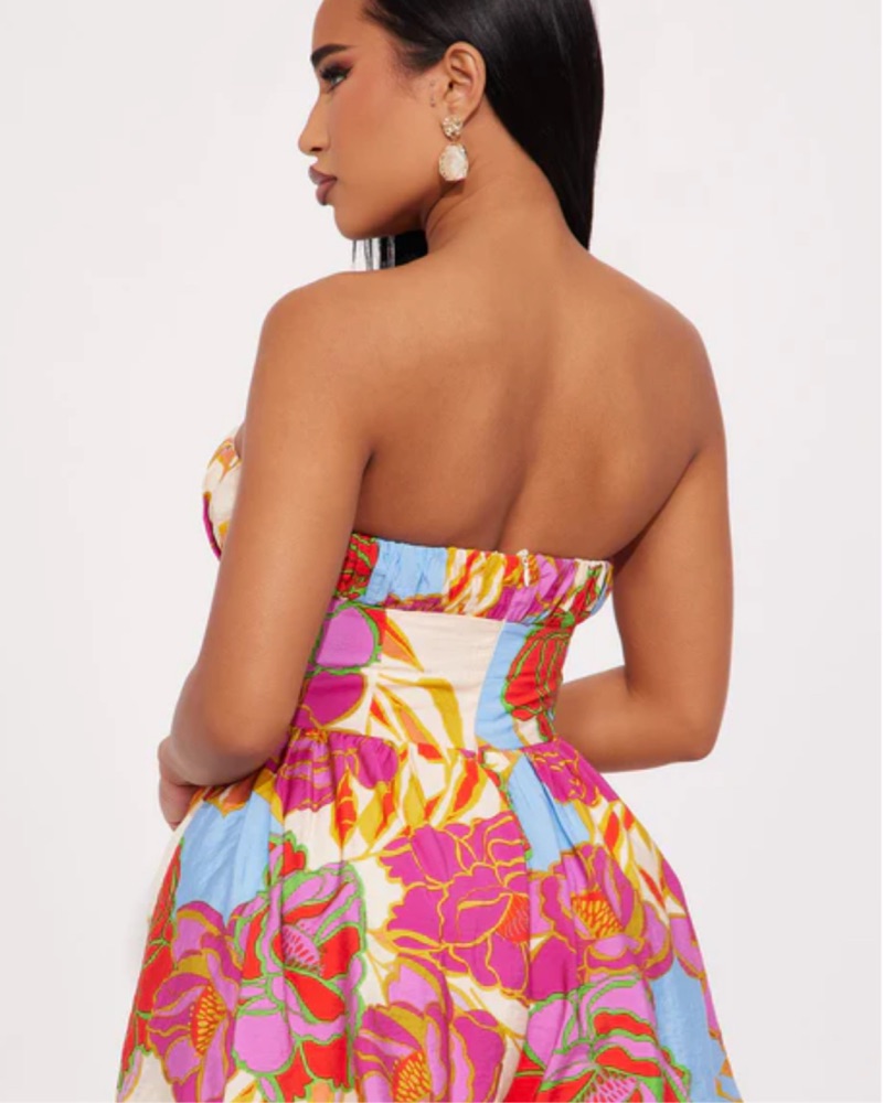 Floral romper mini dress! Looks like a mini dress but technically has the short seam, Size S, strapless styls, from Fashion Nova! Perfect for summer, never worn. Tags: fashion nova, mini dress, romper, Frankie’s bikinis, peppermayo, white fox boutique, house of CB, free people