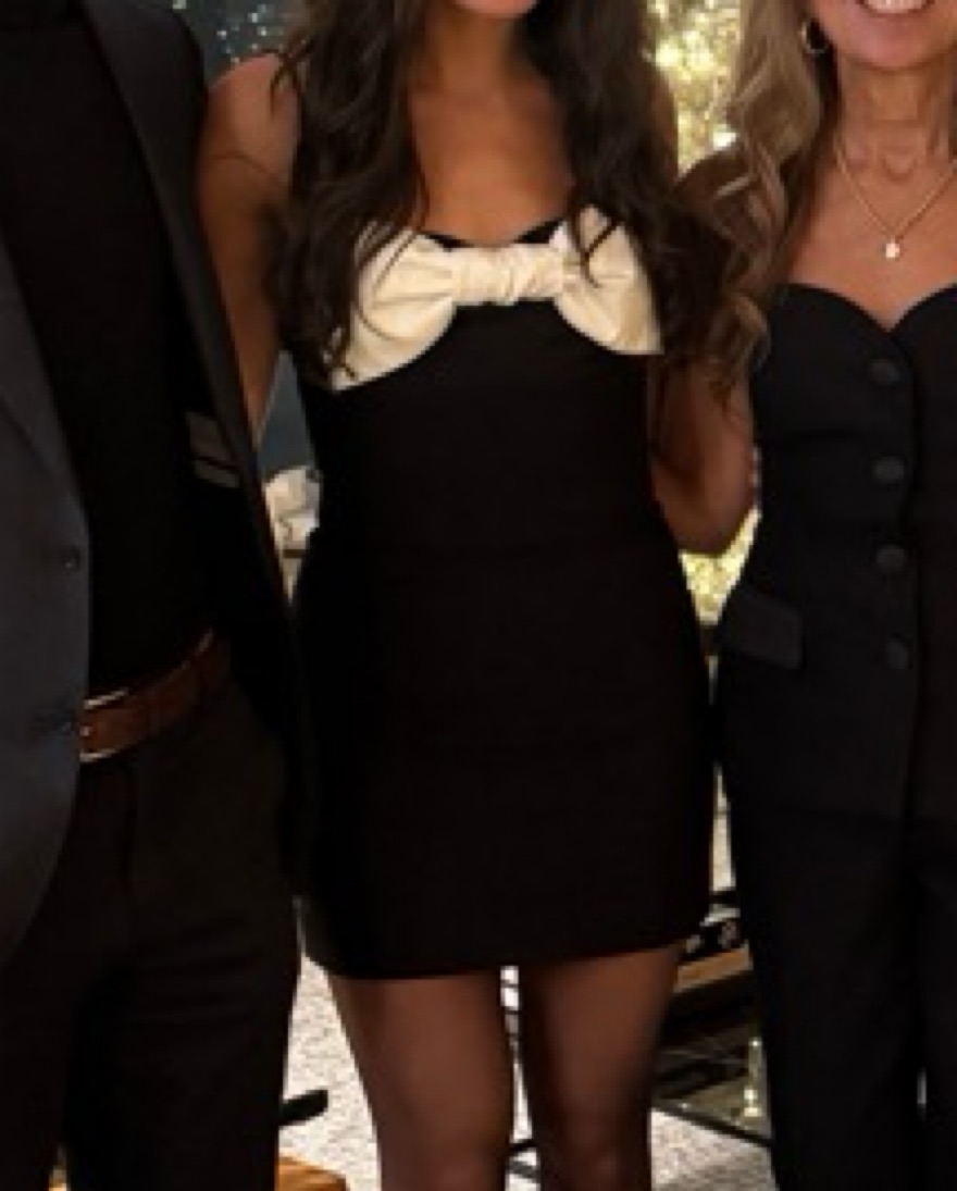Mini black holiday dress wirh white bow. Formal name on revolve - Majorelle Sutton Mini Dress in Black & Ivory, zips in back. Fits true to size and very flattery. Dry clean only