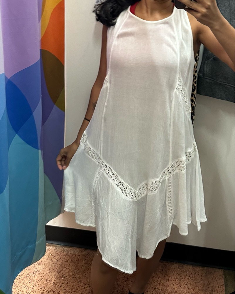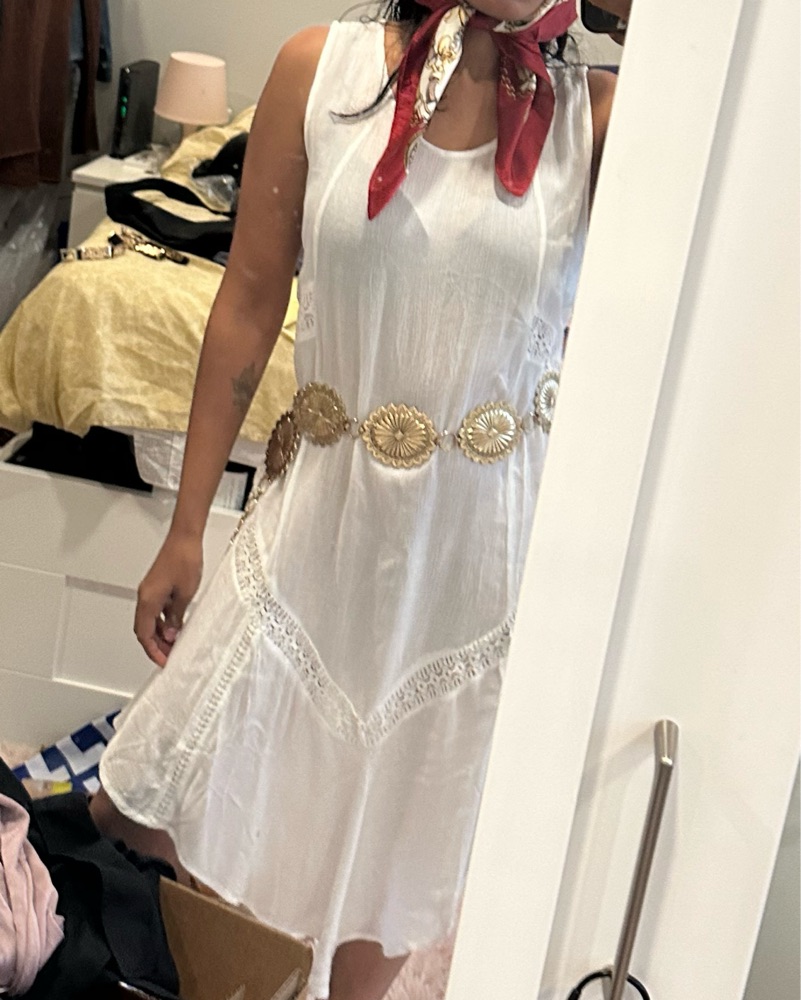 Super cute flowy white dress brand tag says “Cute Options” size small — perfect for boho looks and pairs super well with a belt!