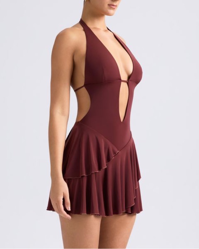 Oh Polly Chimere Ruffled Cut-Out Halterneck Mini Dress in Chestnut Brown. Size US 2, no longer sold at all! Worn twice and in flawless condition. Might be my favorite dress of all time. Comes with built in shorts so you never have to worry about anything showing. I will handwash upon return back.