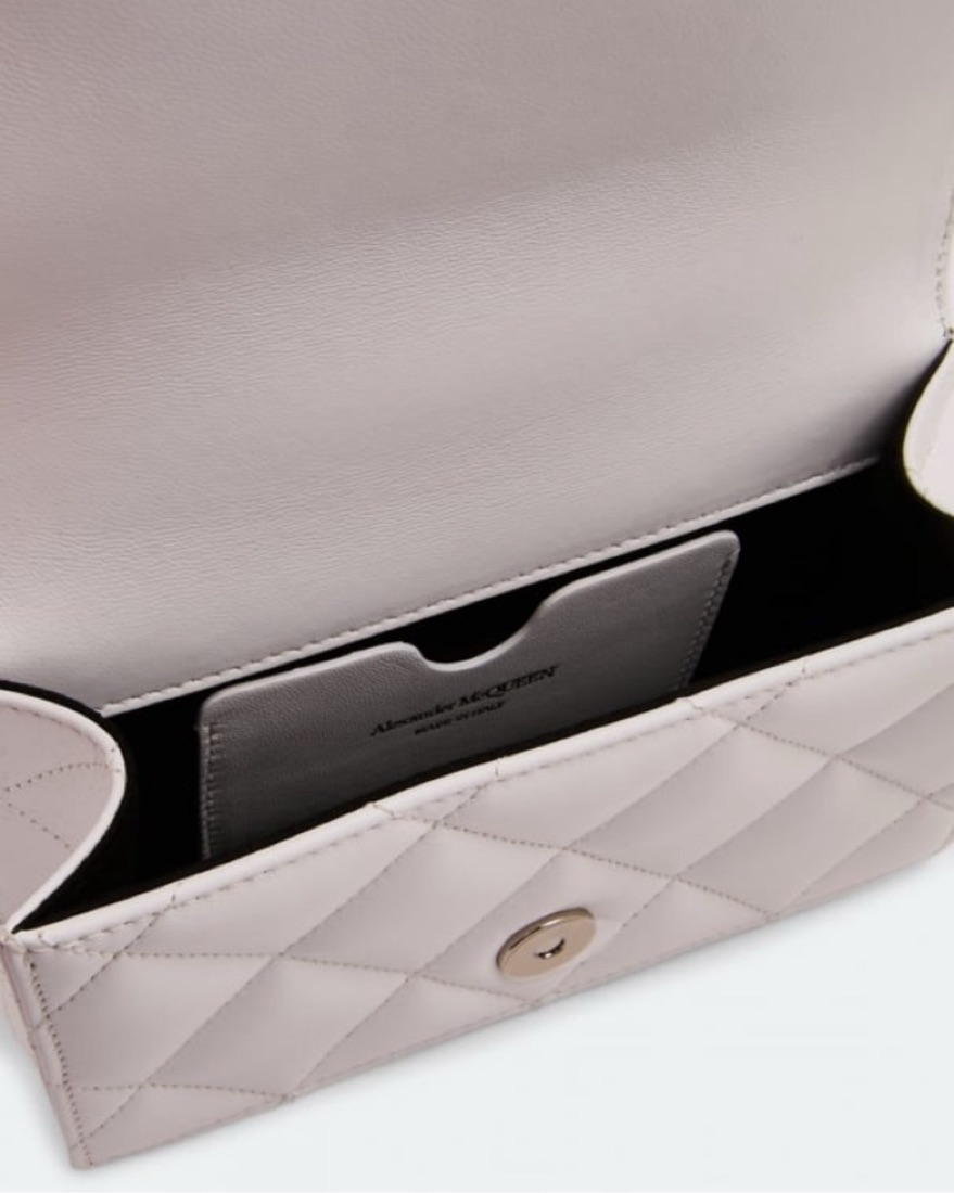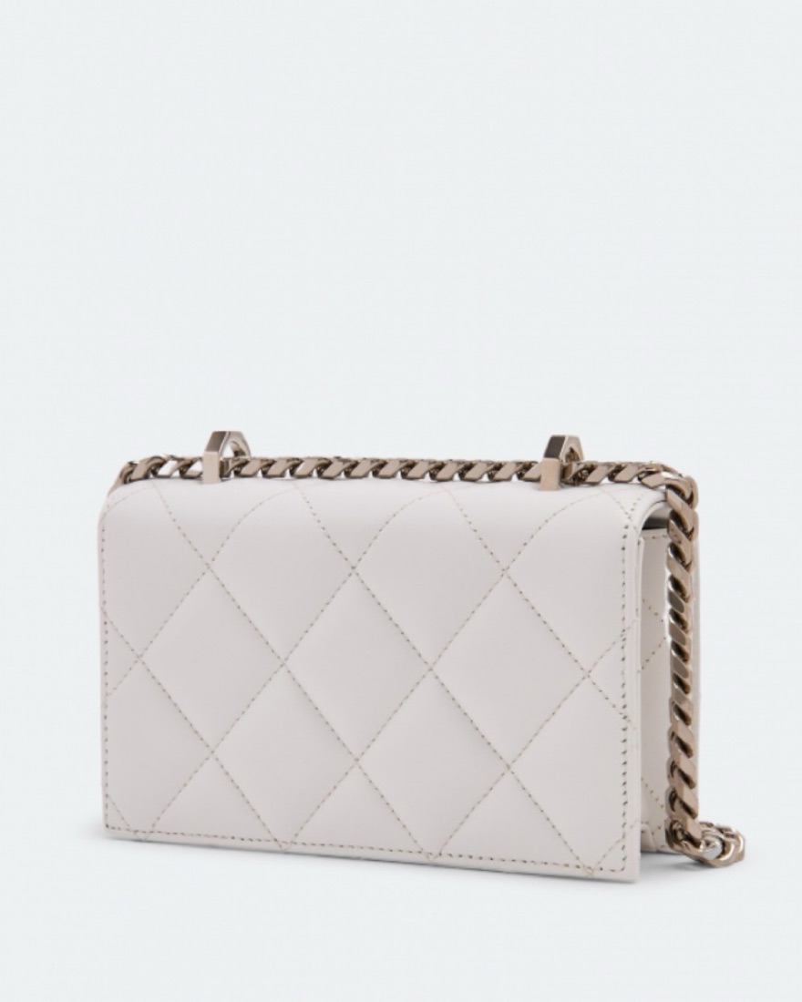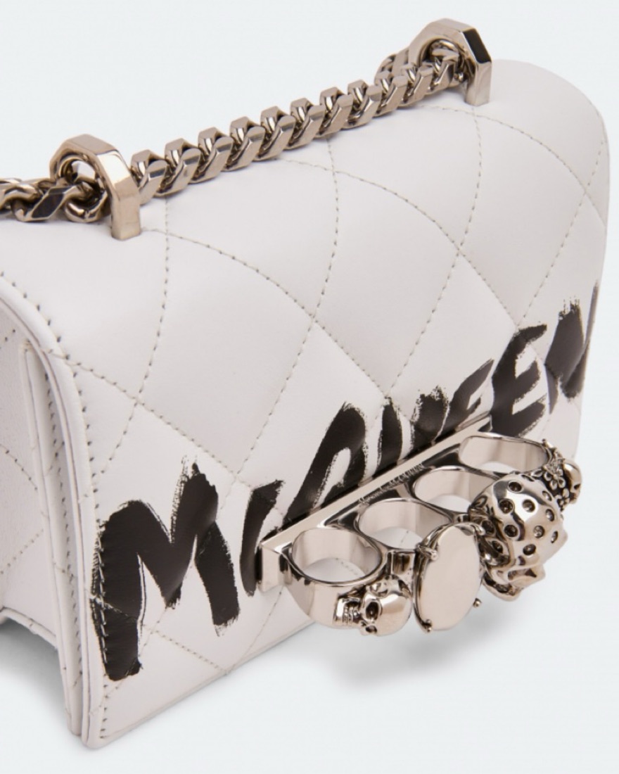 Alexander McQueen graffiti knuckle clutch in quilted white leather with signature skull-ring handle. Comes with original box and dust bag. A rare statement piece that turns every look into a moment.